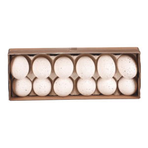 Dotaz na produktBalení obsahuje 12 pravých slepičích vajec v bílé barvě s jemným kropenatým vzorem. Vajíčka jsou pečlivě vybraná a vhodná pro široké využití k aranžování. Jejich přirozený vzhled a velikost zaručují oživení každé velikonoční dekorace. Balení je praktické pro skladování i manipulaci.