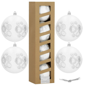 Ozdoby jsou vyrobeny z nerozbitného plastového materiálu, který zajišťuje bezpečné používání a dlouhou životnost. Jsou lehké, snadno se zavěšují pomocí poutka na zavěšení, které je součástí balení, a díky své odolnosti jsou vhodné pro vnitřní i venkovní použití. Sada obsahuje 4 kusy koulí, které dodají vaší vánoční výzdobě jemnou eleganci a zářivý zimní půvab.