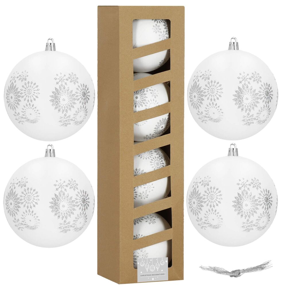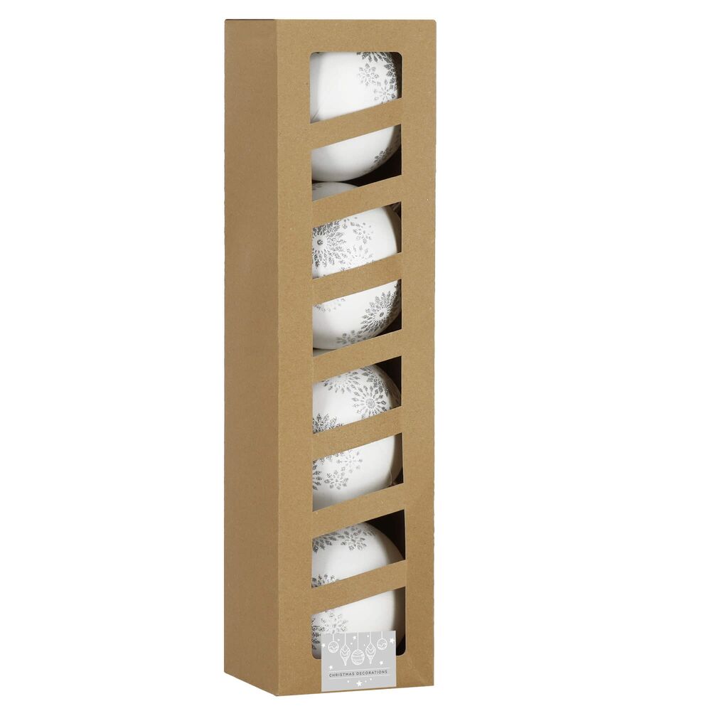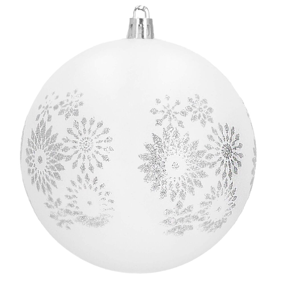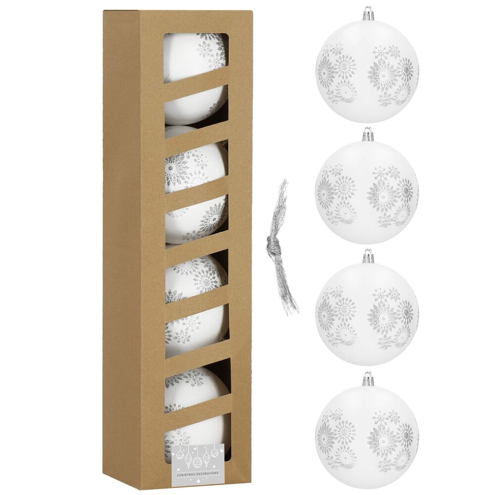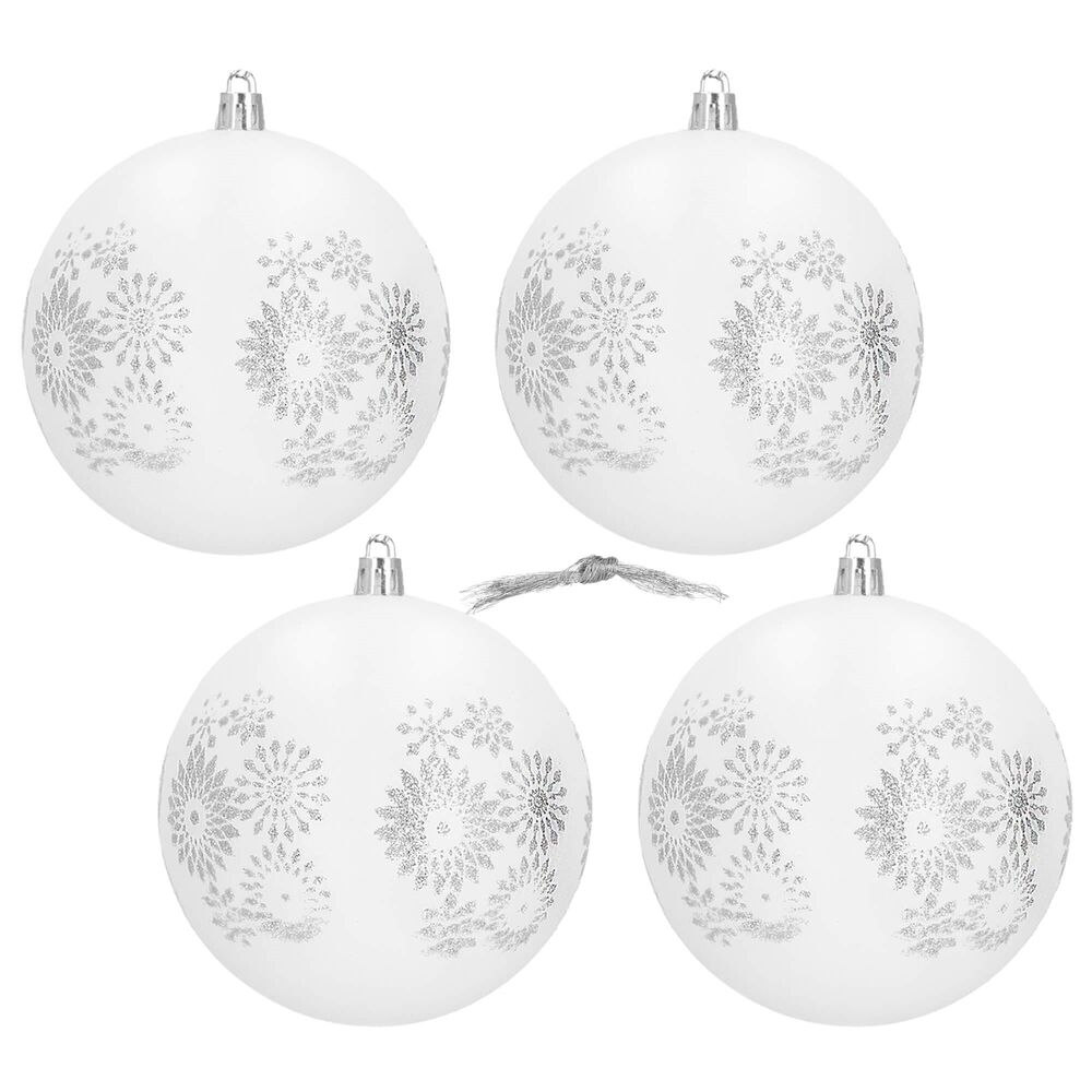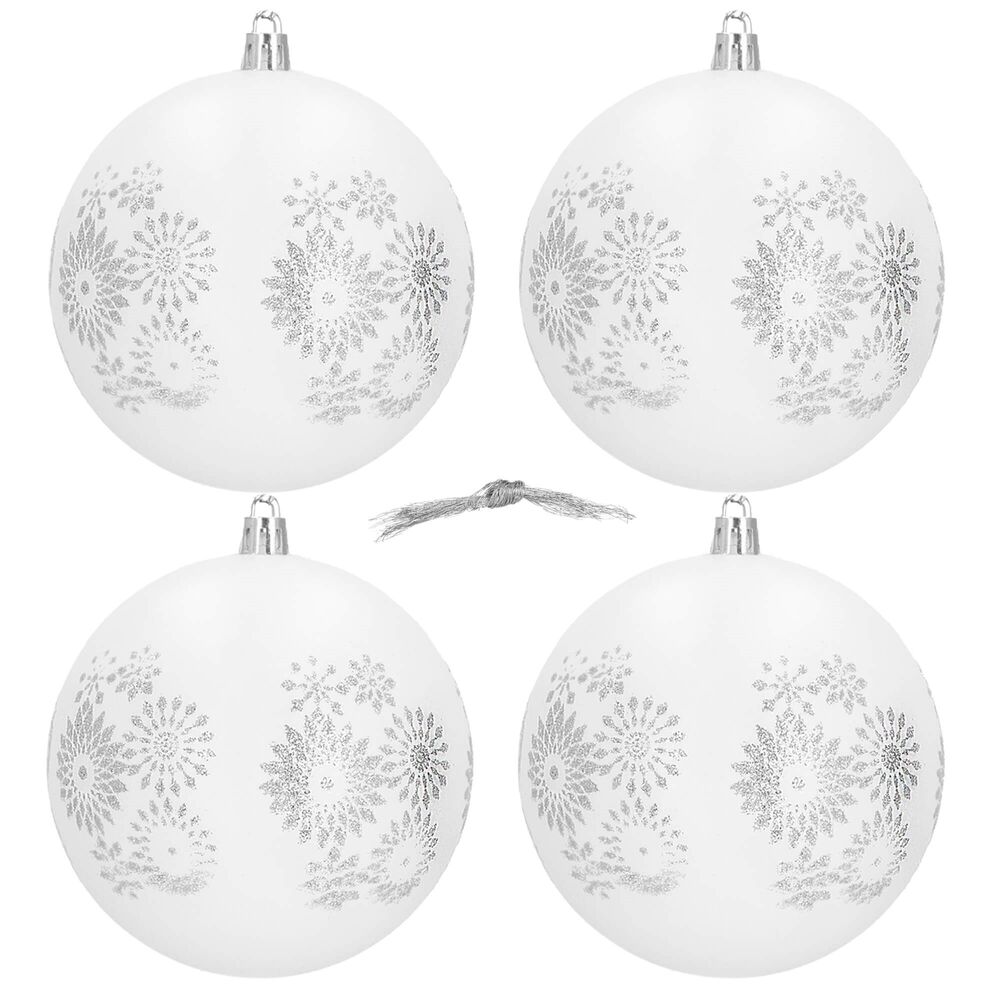 Elegantní sada vánočních ozdob v bílém provedení se stříbrným zdobením dodá vaší výzdobě čistý a slavnostní vzhled. Koule o průměru 9 cm jsou ideální na vánoční stromeček i jako dekorace do interiéru. Vyrobeny z nerozbitného plastu, vhodné pro vnitřní i venkovní použití. Součástí balení jsou poutka na zavěšení. Celkem 4 kusy v sadě.