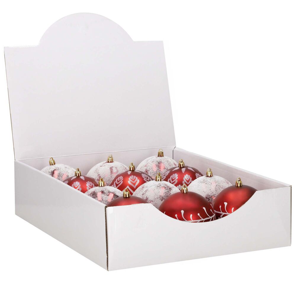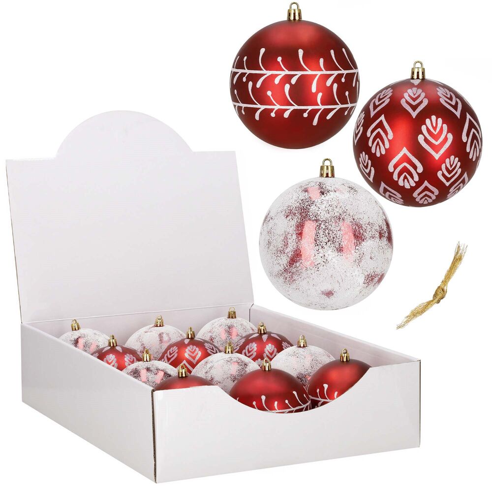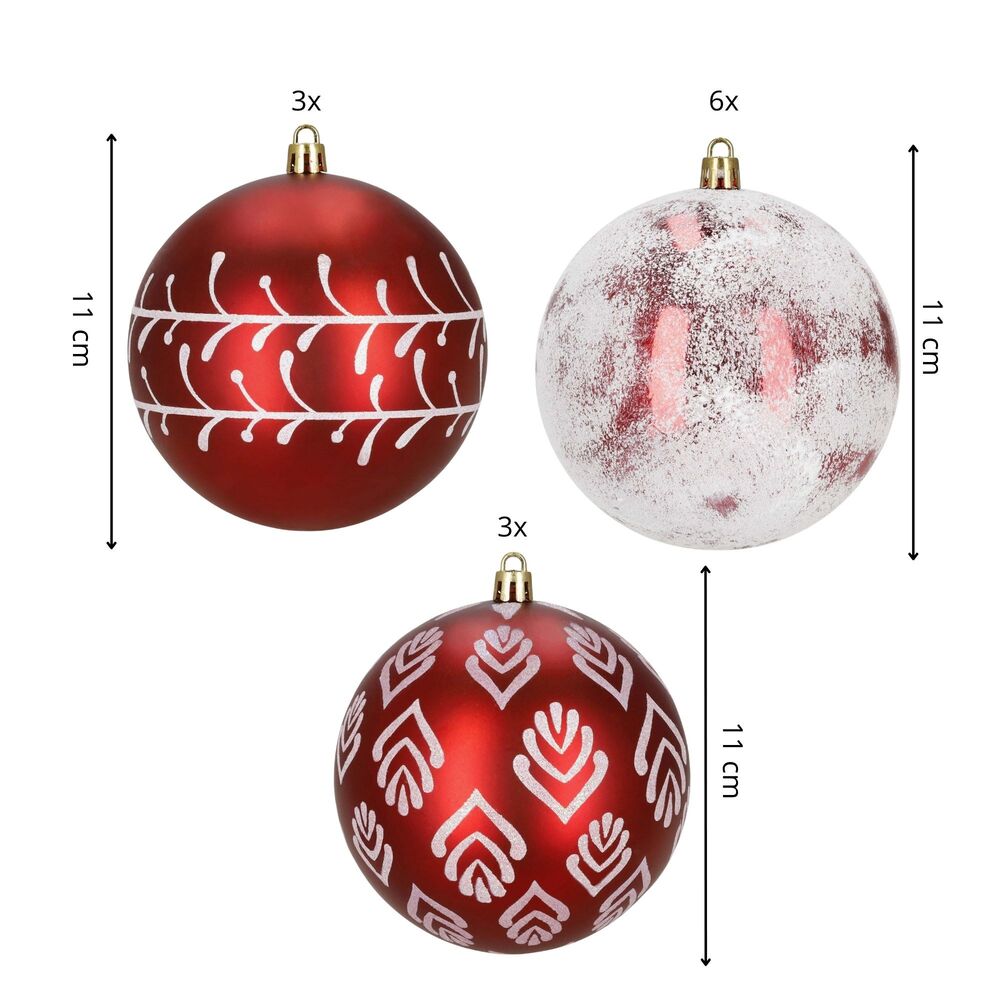 Sada červených vánočních koulí s bílým zdobením a zasněženým efektem dodá výzdobě výrazný sváteční nádech. Skvělé na stromeček i do dalších dekorací. Vyrobené z nerozbitného plastového materiálu, vhodné pro vnitřní i venkovní použití. Díky poutkům je zavěšení jednoduché a rychlé. Průměr 9,5 cm, celkem 12 kusů.
