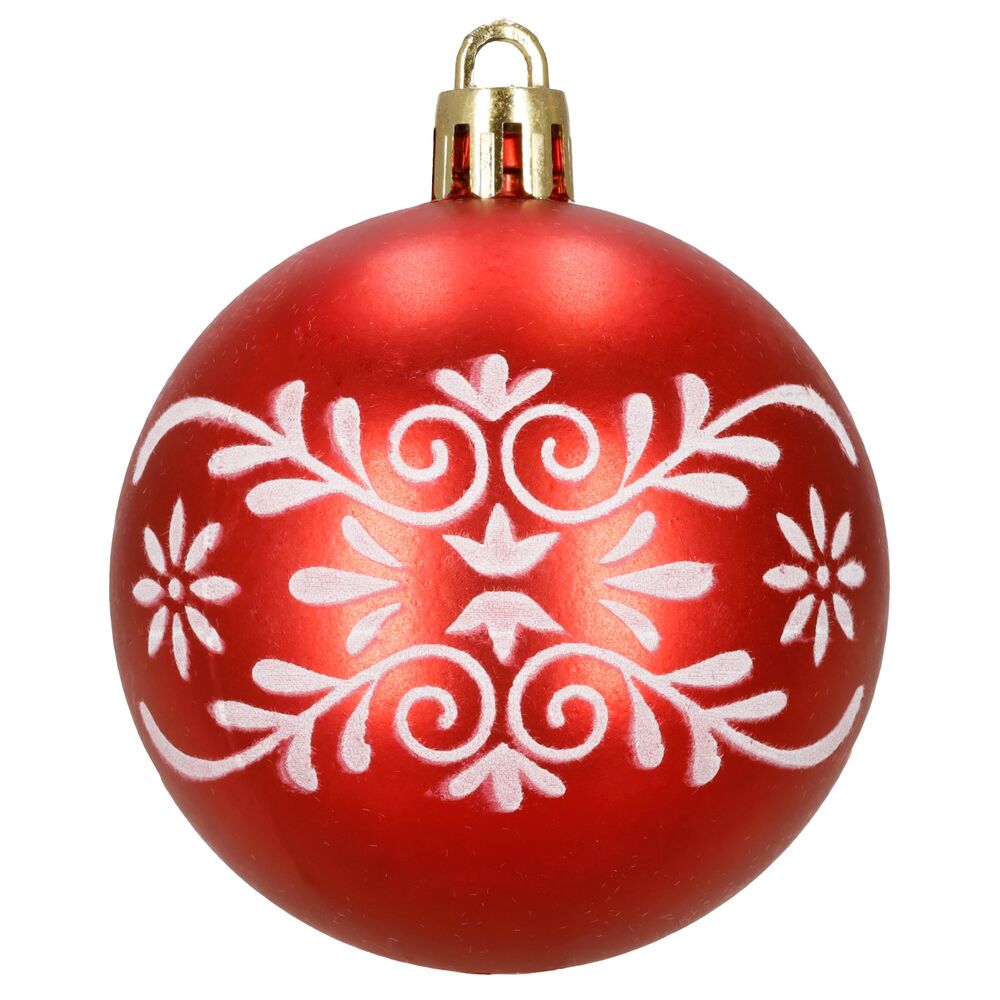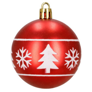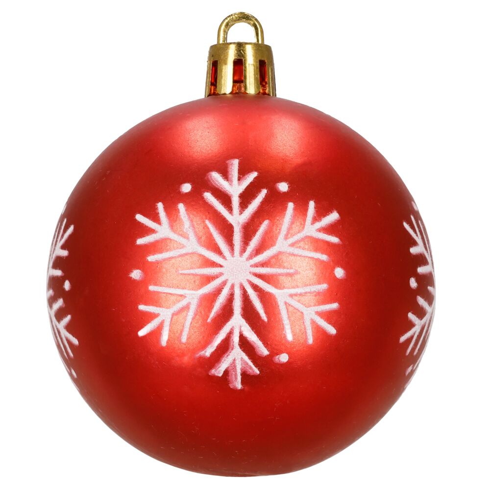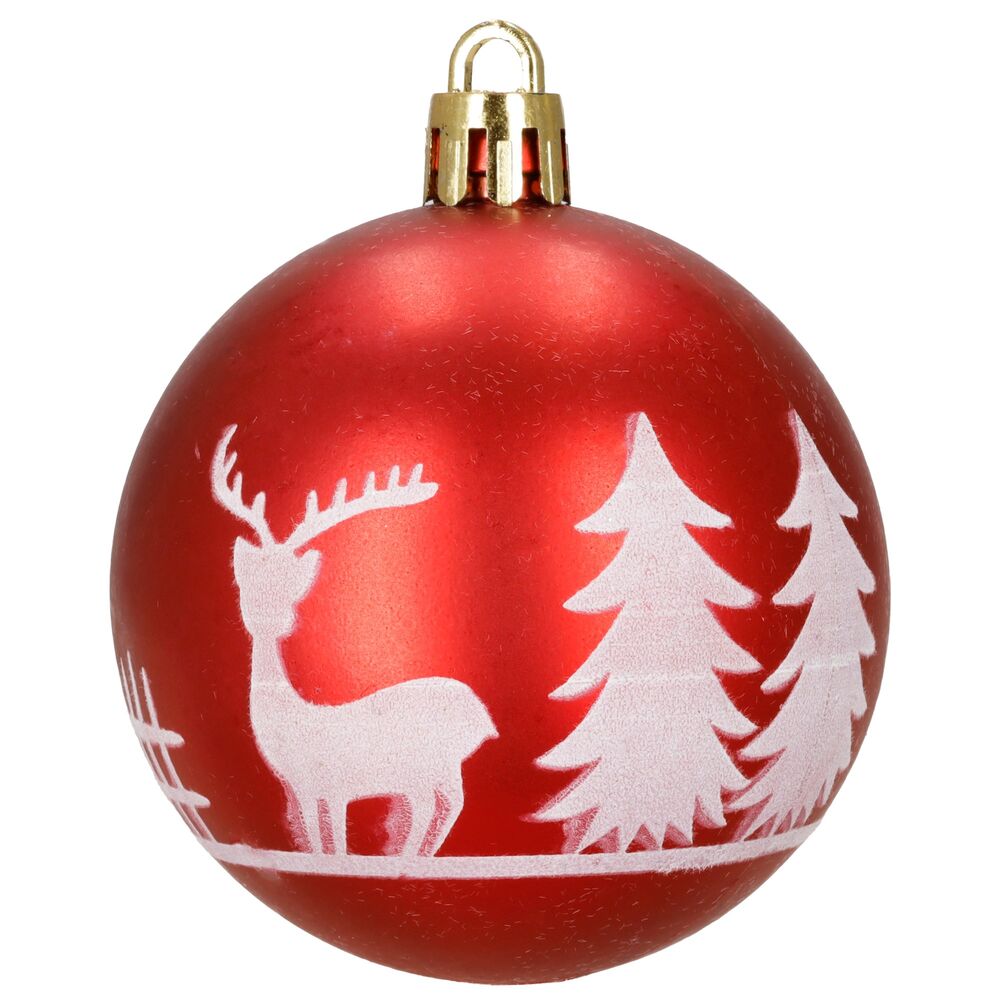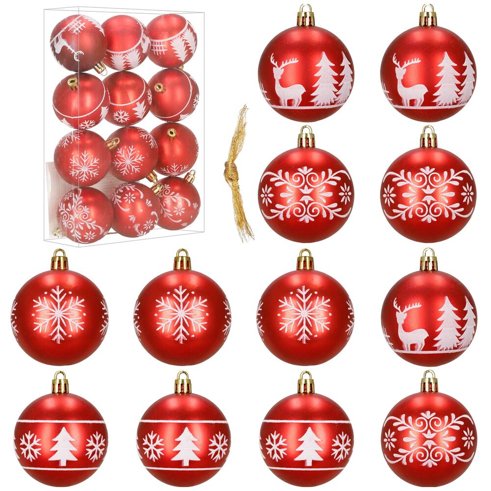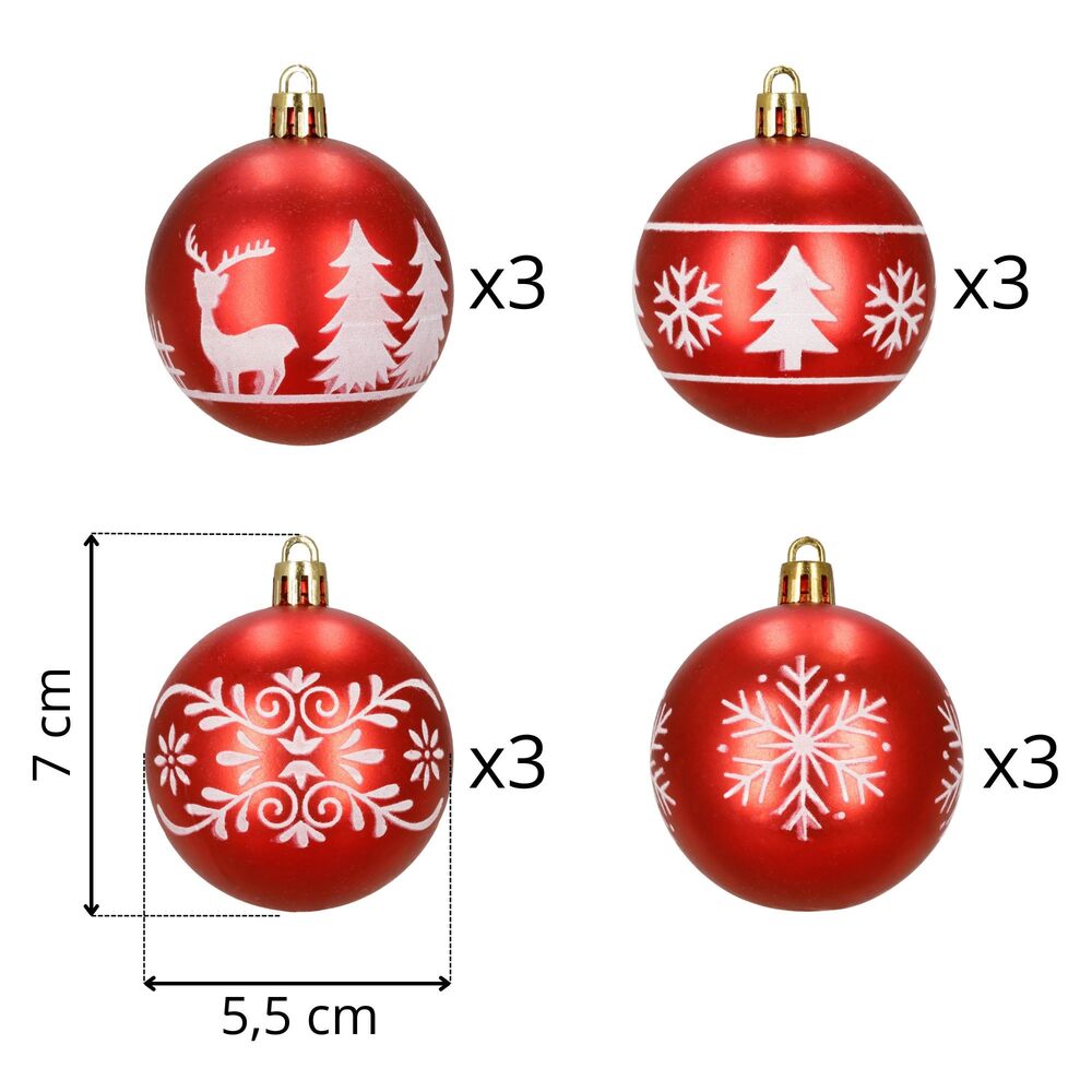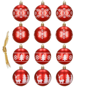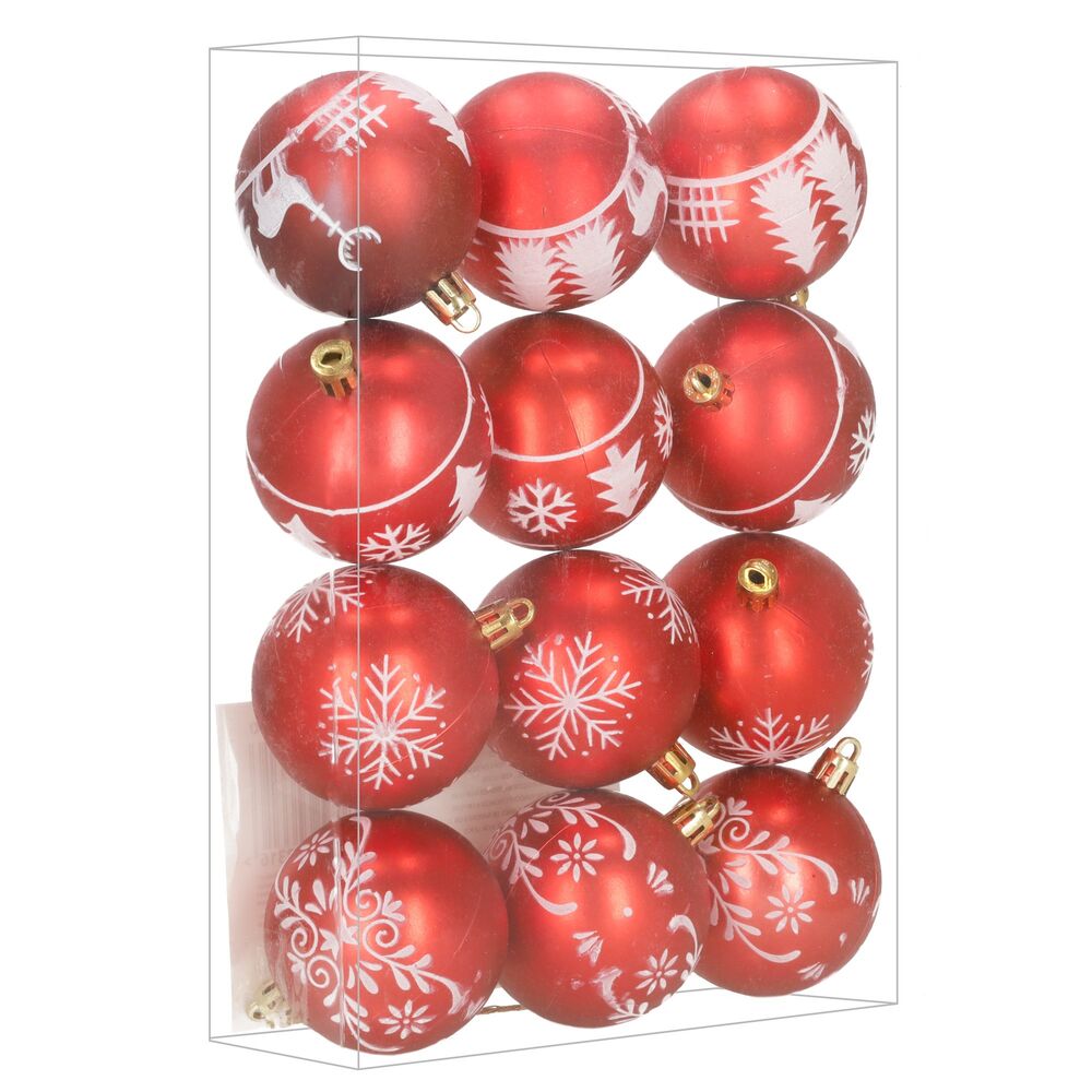 Sada červených vánočních ozdob s bílým zimním zdobením dodá výzdobě tradiční a veselý vzhled. Ideální na vánoční stromeček, sváteční stůl i do oken. Vyrobeny z nerozbitného plastového materiálu, vhodné pro vnitřní i venkovní použití. Součástí balení jsou poutka pro zavěšení. Průměr 5,5 cm, celkem 12 kusů v sadě.