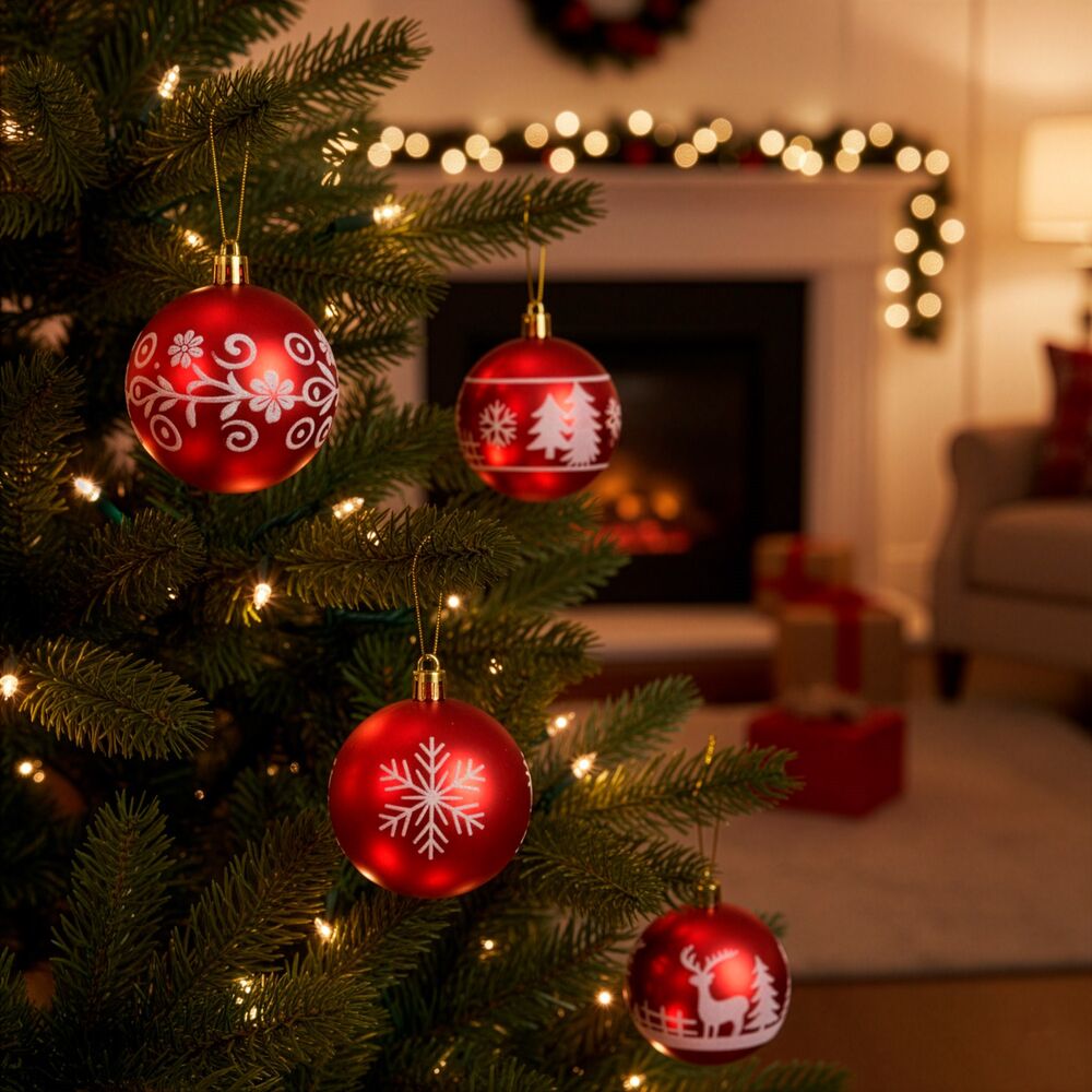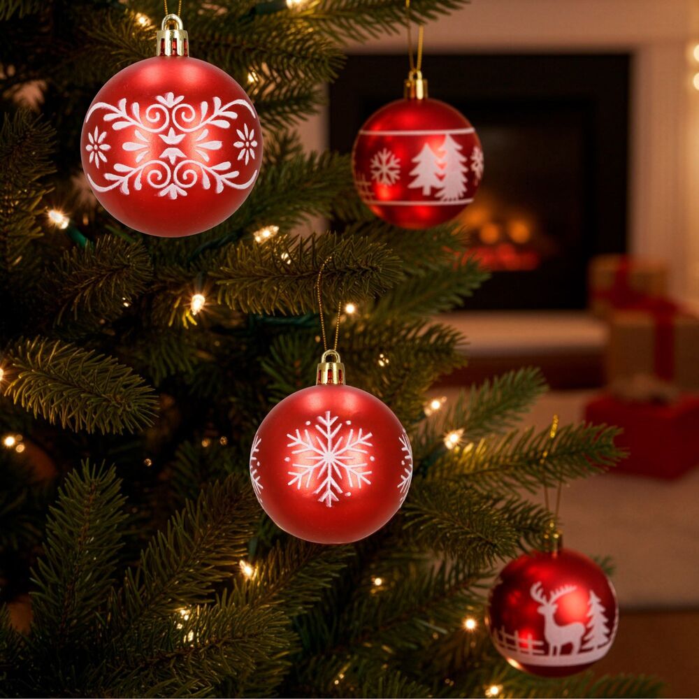 Vánoční baňky červené mix – 6 cm, sada 12 ks dodají vaší výzdobě tradiční a veselou vánoční atmosféru. Sytě červená barva doplněná o bílé zimní zdobení v podobě vloček, stromečků a sobů vytváří krásný kontrast, který na stromečku okamžitě vynikne. Díky univerzálnímu designu jsou tyto ozdoby vhodné také na sváteční stůl či jako doplněk do okenních dekorací.