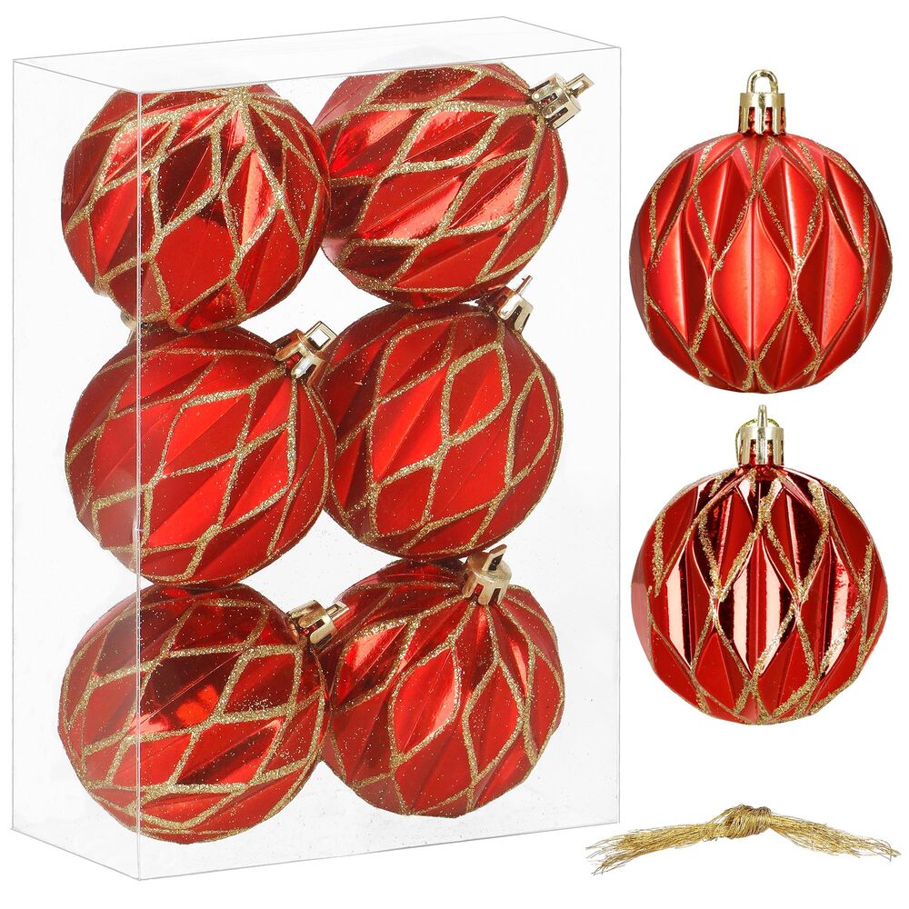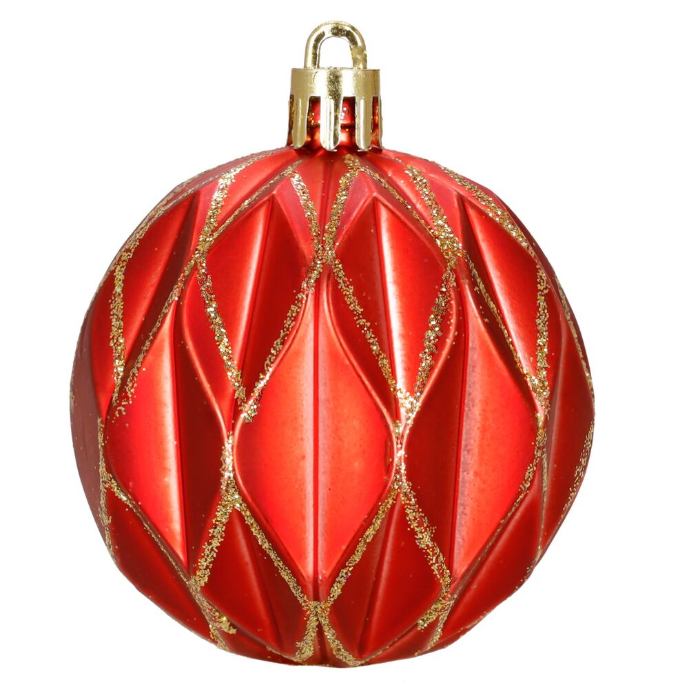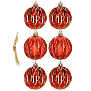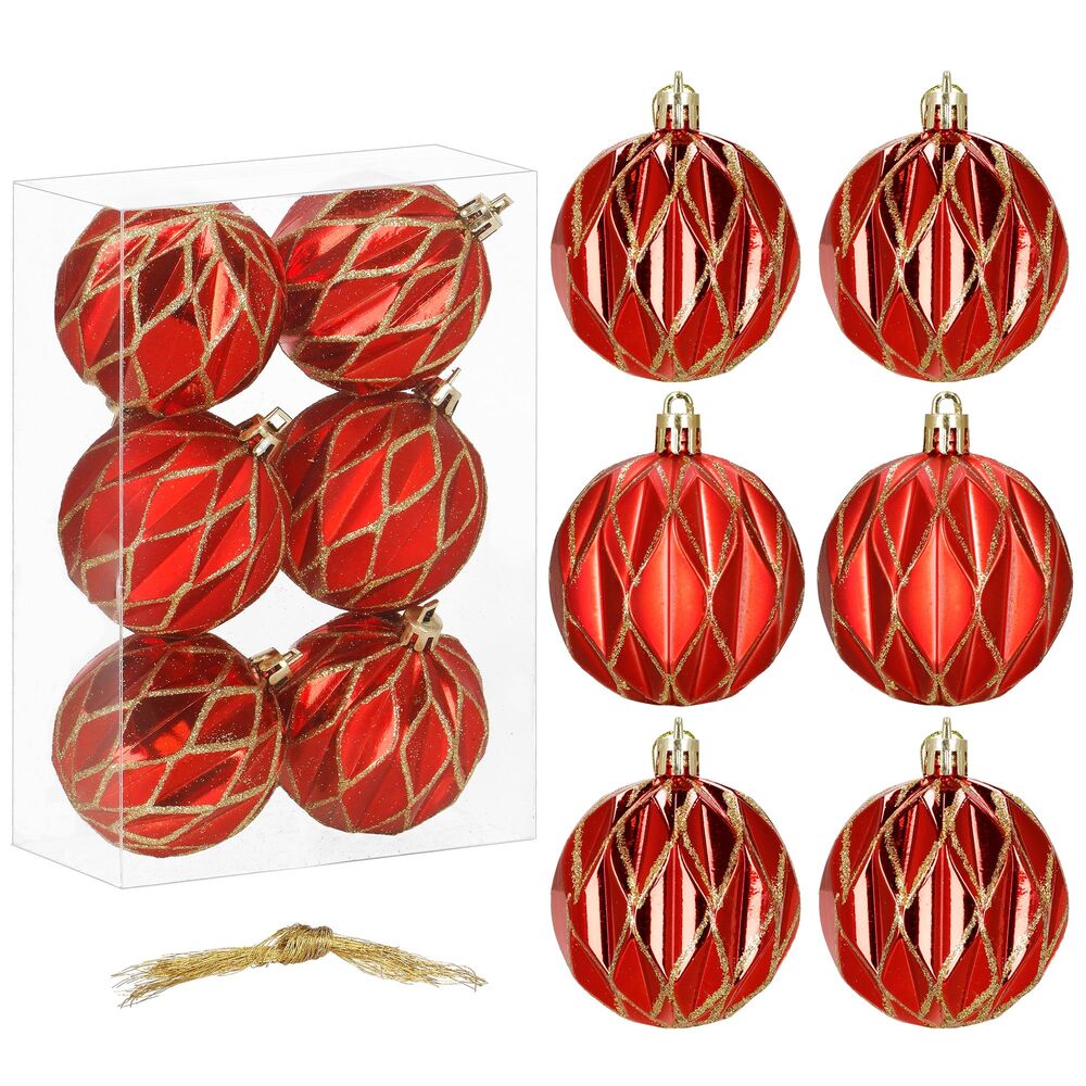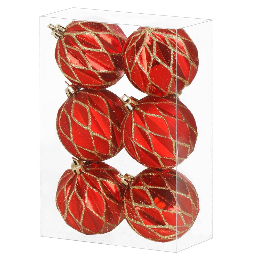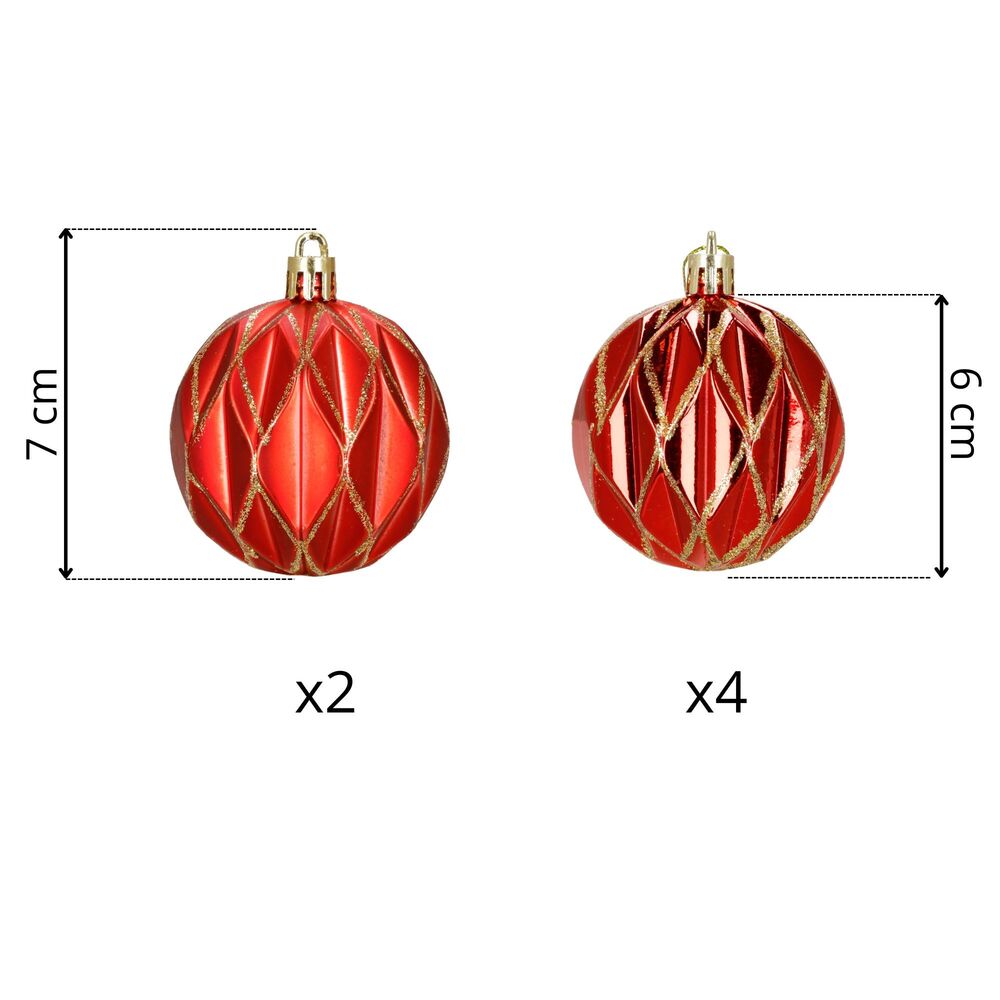 Sada červených vánočních koulí se zlatým dekorem dodá výzdobě tradiční a elegantní vzhled. Ideální jako ozdoba na vánoční stromeček i do dalších svátečních dekorací. Vyrobeny z nerozbitného plastového materiálu, vhodné pro vnitřní i venkovní použití. Součástí balení jsou poutka pro snadné zavěšení. Průměr 6 cm, celkem 6 kusů v sadě.