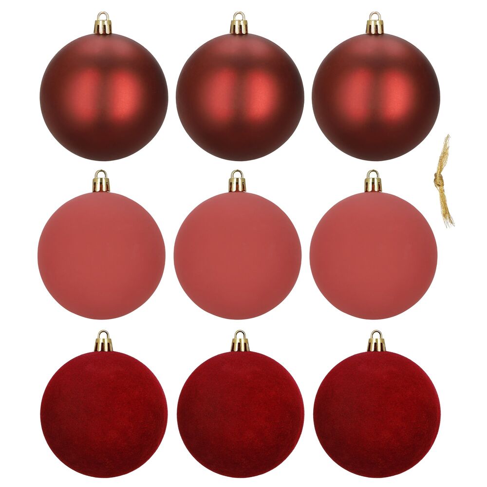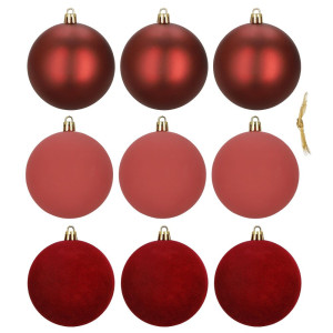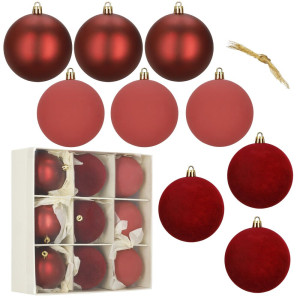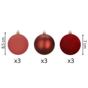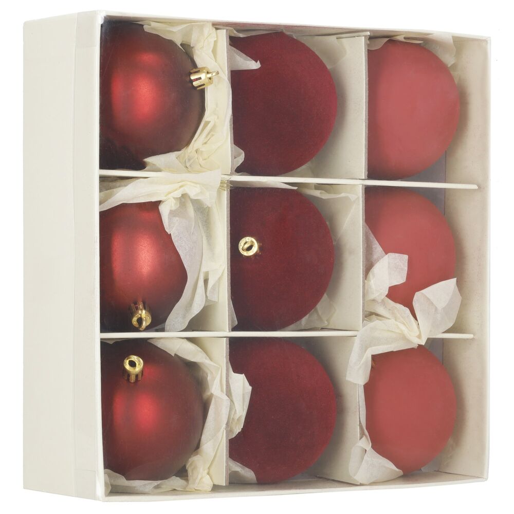 Sada červených vánočních koulí v matném, lesklém a sametovém provedení dodá výzdobě teplý a elegantní vzhled. Ideální na stromeček i do dekorací. Vyrobené z nerozbitného plastového materiálu, vhodné pro vnitřní i venkovní použití. Díky poutkům je zavěšení rychlé a snadné. Průměr 7 cm, celkem 9 kusů.