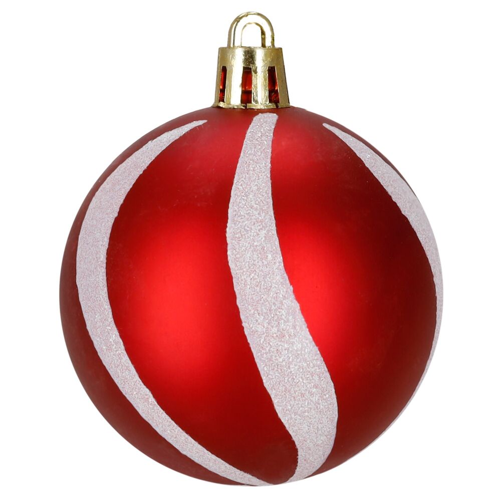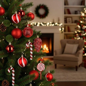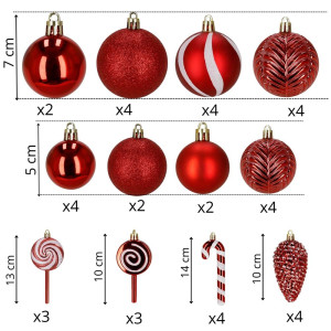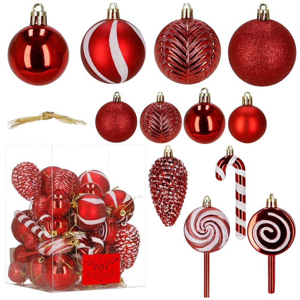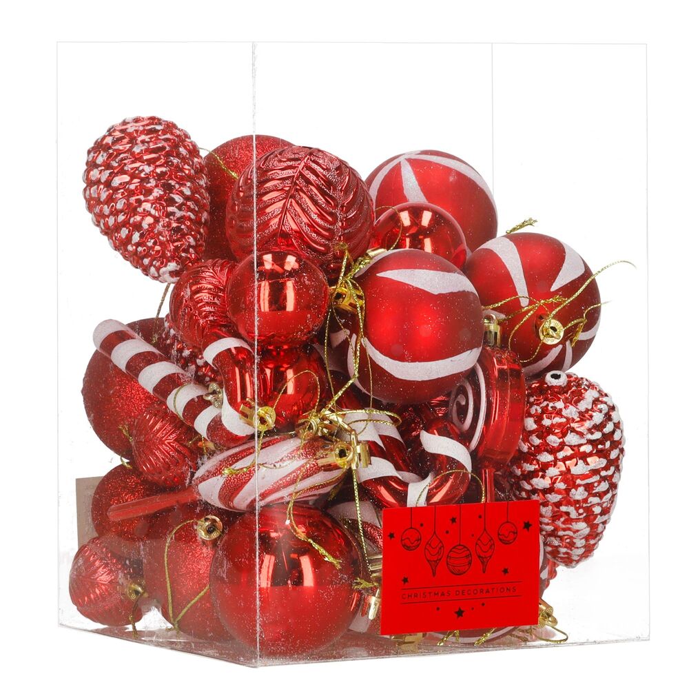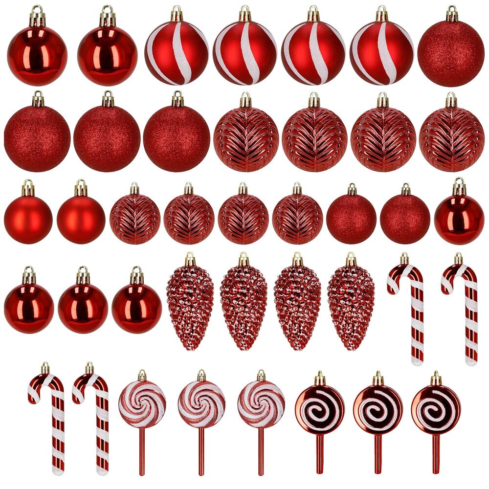 Sada červených vánočních ozdob v různých tvarech a povrchových úpravách dodá výzdobě výrazný a hravý sváteční vzhled. Obsahuje lehké, nerozbitné plastové koule, šišky i ozdoby ve tvaru lízátek a cukrátek, vše s poutky pro snadné zavěšení. Vhodné na stromeček i jako dekorace do interiéru či exteriéru. Průměry koulí: 4 cm, 5 cm a 6 cm.