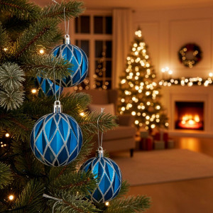 Vánoční baňky modré – 6 cm, sada 6 ks dodají vašemu stromečku i sváteční výzdobě elegantní zimní nádech. Sytě modrá barva v kombinaci se stříbrným třpytivým vzorem vytváří výrazný dekorativní efekt, který vynikne v jakémkoli interiéru. Tyto ozdoby jsou ideální nejen na vánoční stromeček, ale také do různých aranžmá či moderních dekorací, které potřebují barevný akcent.
