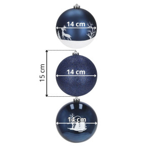 Elegantní sada vánočních ozdob v modrém mixu s bílým zdobením dodá vaší výzdobě zimní kouzlo a eleganci. Koule o průměru 15 cm jsou ideální na vánoční stromeček nebo jako samostatná dekorace. Vyrobeny z nerozbitného plastu, vhodné pro vnitřní i venkovní použití. Součástí balení jsou poutka na zavěšení. Celkem 3 kusy v sadě.