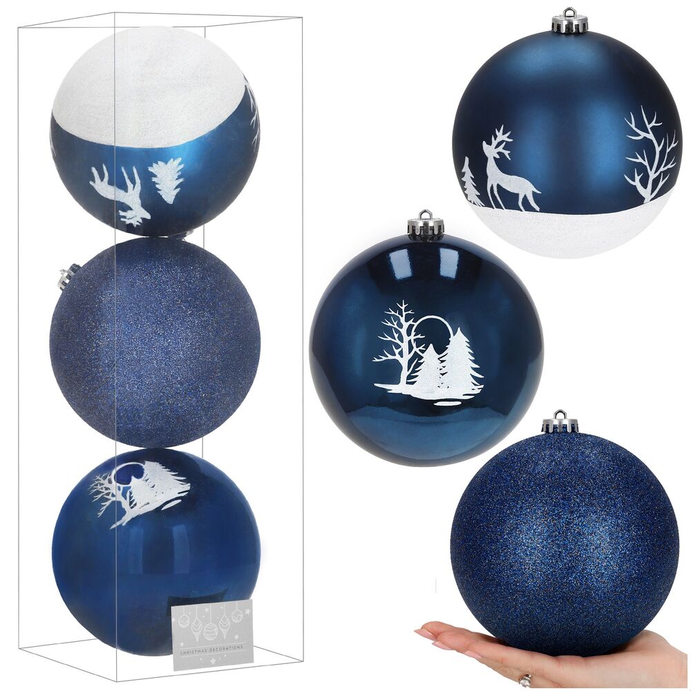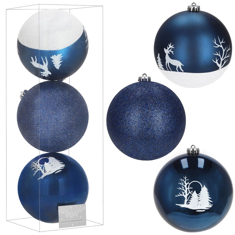Vánoční baňky modré mix – 15 cm, sada 3 ks CA1363, přinášejí do vašeho domova elegantní zimní atmosféru. Kombinace tmavě modré barvy s bílým zdobením působí jemně a slavnostně, ideální pro vánoční stromeček, věnec nebo jako samostatnou dekoraci. Díky svému velkému průměru 15 cm se stanou výrazným prvkem každé vánoční výzdoby a dodají prostoru jedinečný šarm.