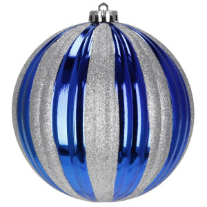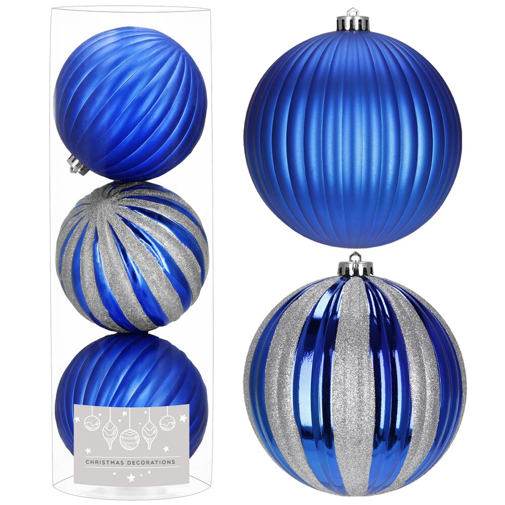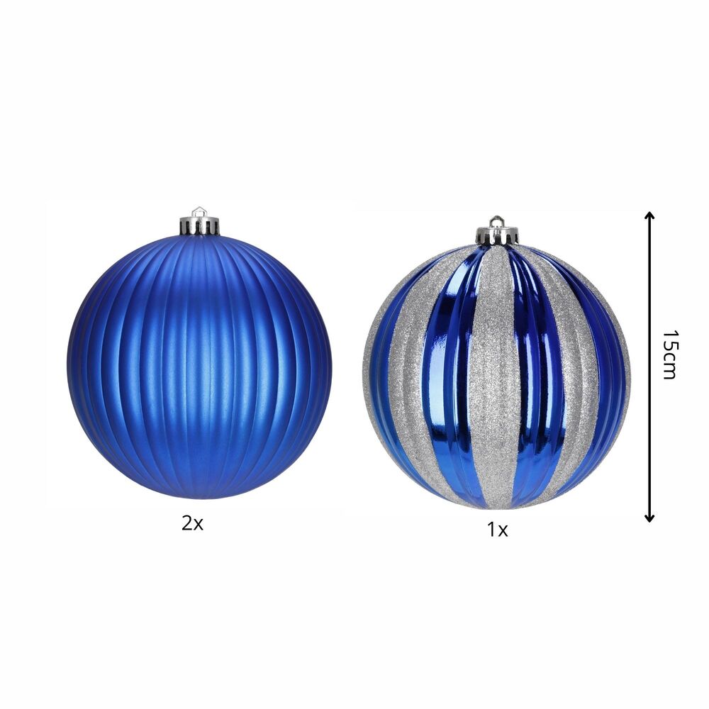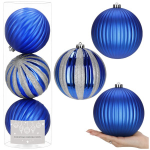 Vánoční baňky modré mix – 15 cm, sada 3 ks CA1366, dodají vaší vánoční výzdobě moderní a elegantní vzhled. Kombinace sytě modré barvy se stříbrným zdobením vytváří jedinečný kontrast, který působí luxusně a slavnostně. Díky svému velkému průměru 15 cm se tyto ozdoby stanou výrazným prvkem na vánočním stromečku, ale i samostatně v různých dekoracích.