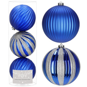 Stylová sada vánočních ozdob v modrém mixu se stříbrným zdobením dodá vaší výzdobě moderní a elegantní vzhled. Koule o průměru 15 cm jsou ideální na vánoční stromeček i jako samostatná dekorace. Vyrobeny z nerozbitného plastu, vhodné pro vnitřní i venkovní použití. Součástí balení jsou poutka na zavěšení. Celkem 3 kusy v sadě.
