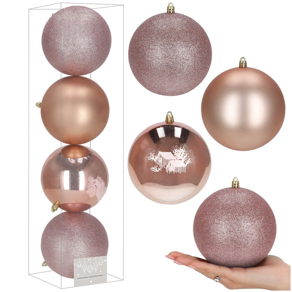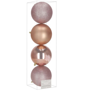Vánoční baňky růžové mix – 12 cm, sada 4 ks CA1359, přinášejí do vašeho domova elegantní a romantickou vánoční atmosféru. Kombinace jemné růžové barvy s bílým zdobením působí moderně a vkusně, díky čemuž tyto ozdoby snadno sladíte s různými styly výzdoby. Velký průměr 12 cm zaručuje, že koule krásně vyniknou na vánočním stromečku i jako samostatná dekorace.
