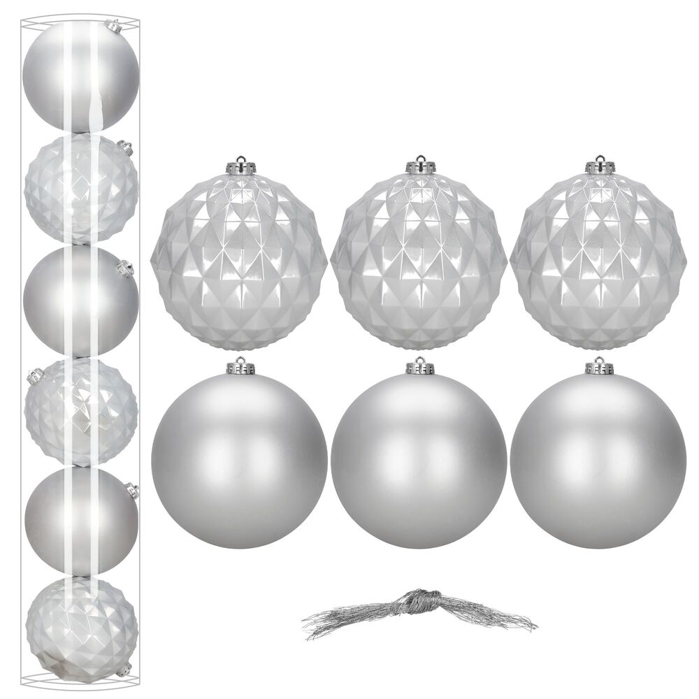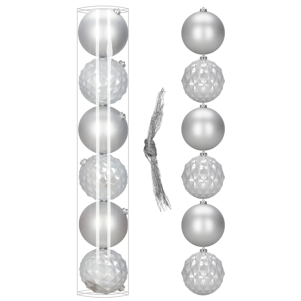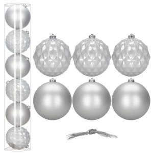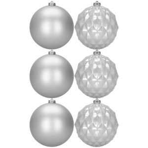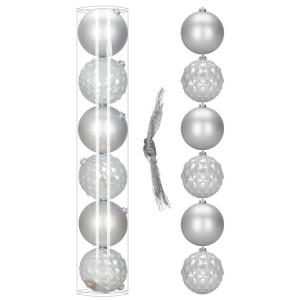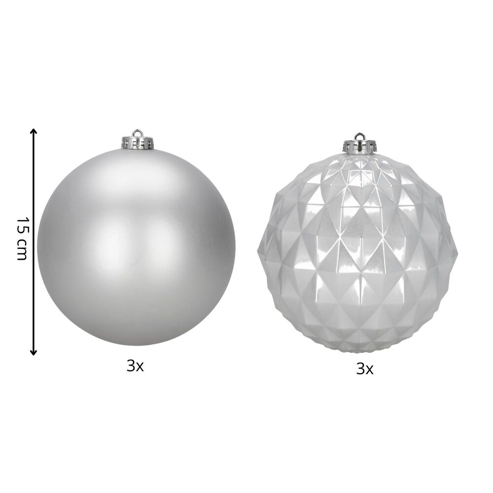 Elegantní sada vánočních ozdob ve stříbrném mixu dodá vaší výzdobě moderní a luxusní vzhled. Koule o průměru 13,5 cm jsou ideální na vánoční stromeček i jako výrazná dekorace. Vyrobeny z nerozbitného plastu, vhodné pro vnitřní i venkovní použití. Součástí balení jsou poutka na zavěšení. Celkem 6 kusů v sadě.