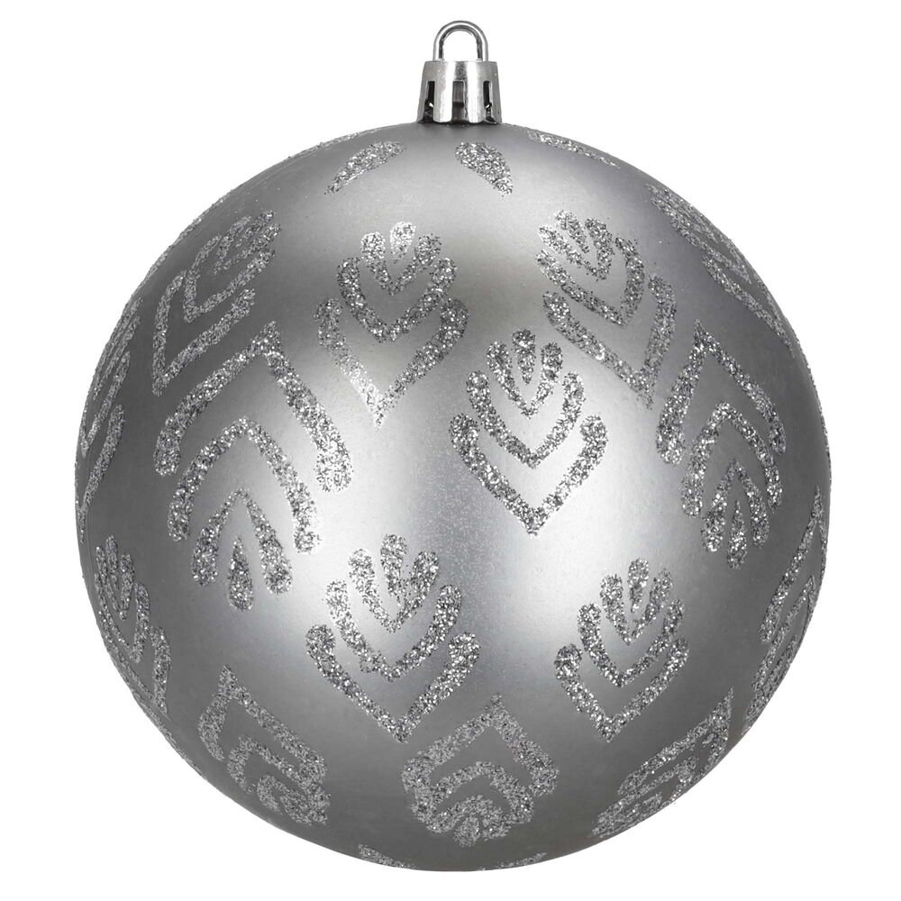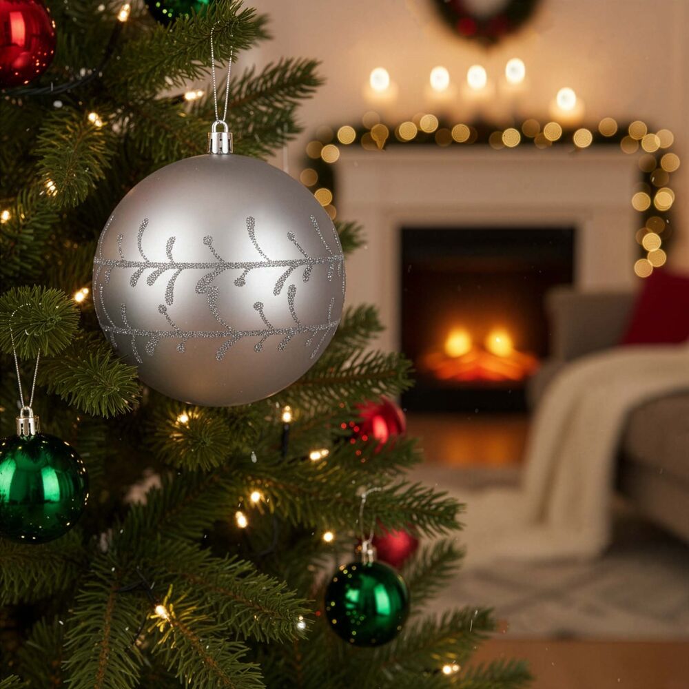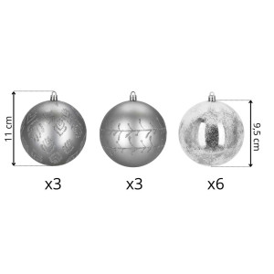Sada 12 ks stříbrných baněk na stromeček se třemi různými vzory. Průměr baňky 9,5 cm, poutko na zavěšení, nerozbitný plastový materiál. Ideální k výzdobě stromečku nebo jako vánoční dekorace. Zdarma provázky pro snadné zavěšení.
