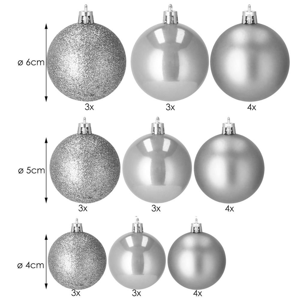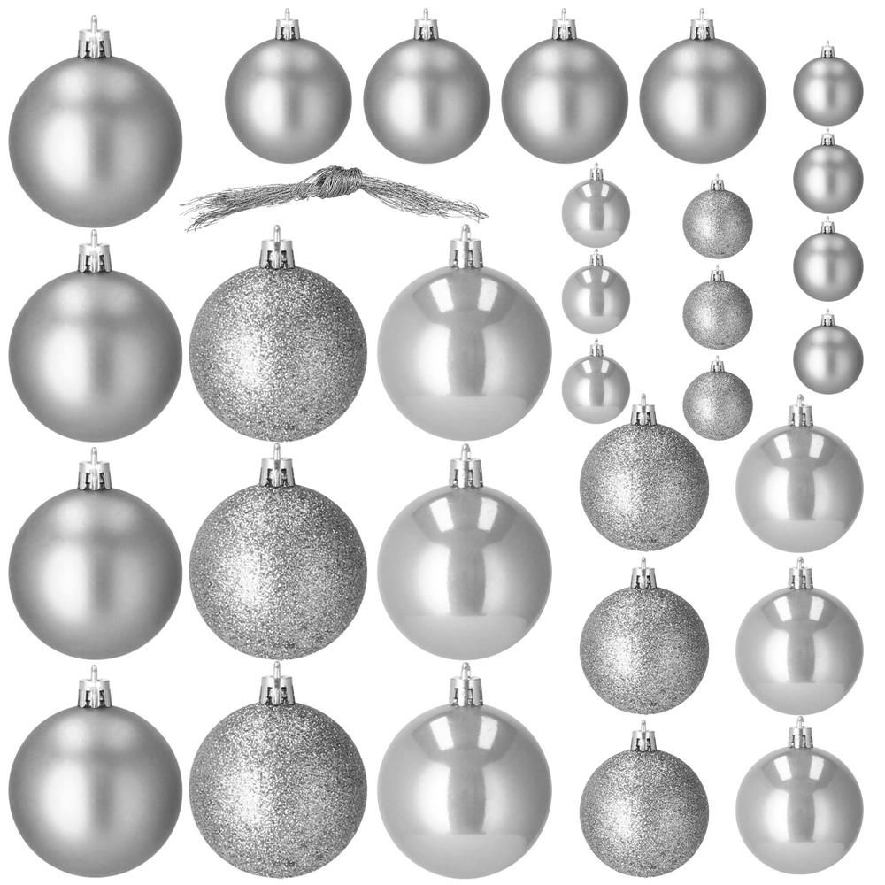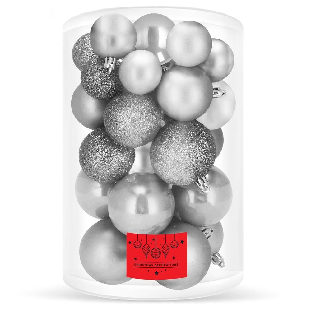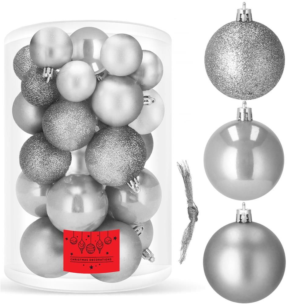 Sada 30 ks šedých a stříbrných baněk na stromeček se třemi různými vzory. Průměr baňky je 4, 5, 6 cm. Poutko na zavěšení, nerozbitný plastový materiál. Ideální k výzdobě stromečku nebo jako vánoční dekorace. Zdarma provázky pro snadné zavěšení.