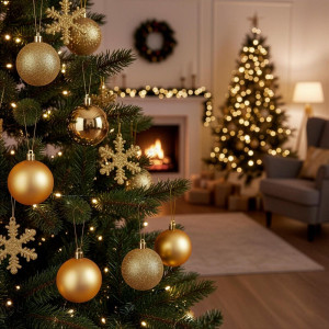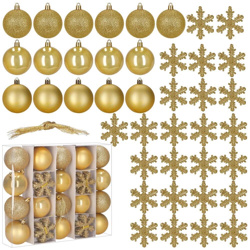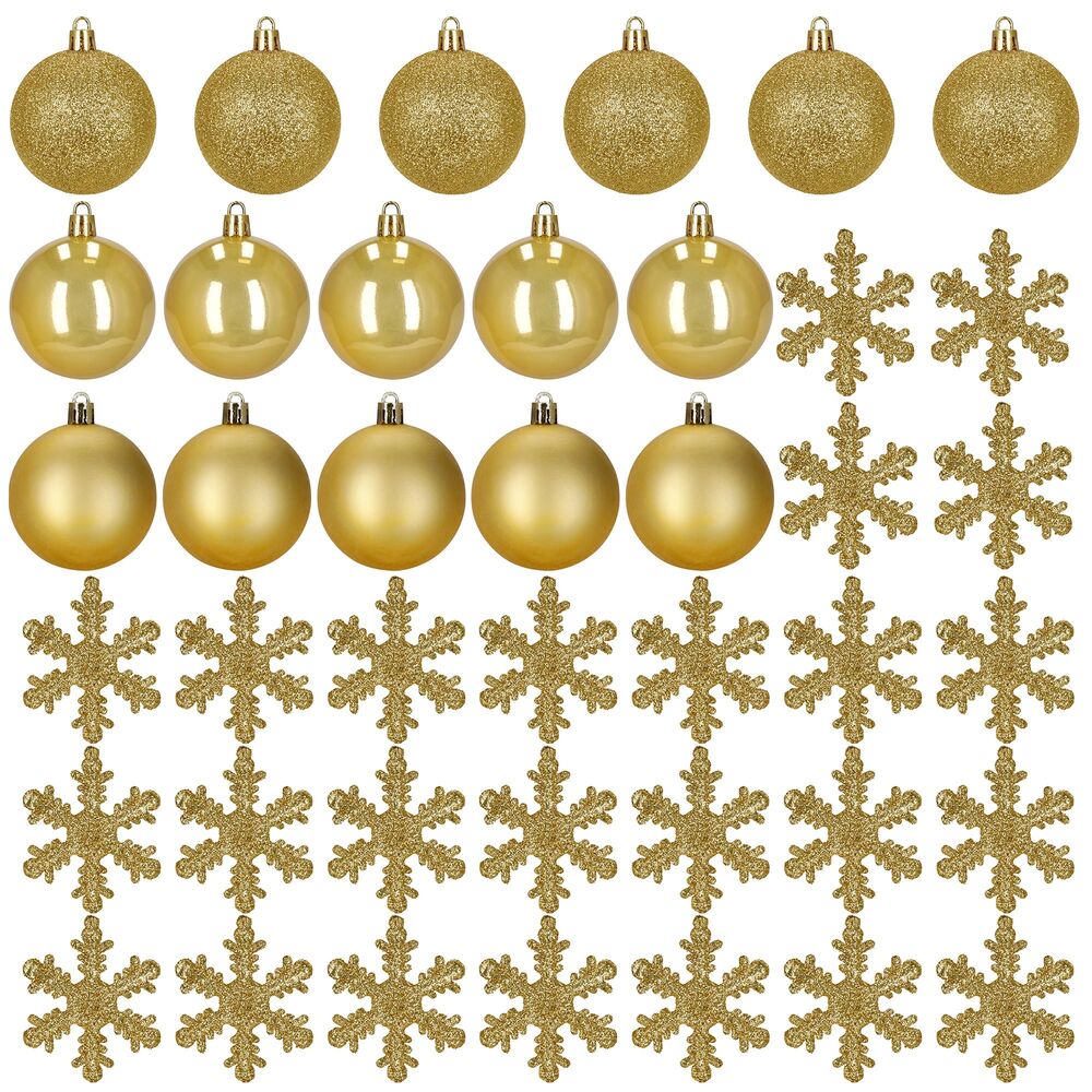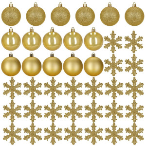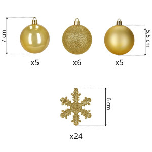 Luxusní sada zlatých vánočních ozdob v lesklém, matném i třpytivém provedení dodá dekoraci slavnostní vzhled. Obsahuje lehké, nerozbitné plastové koule i dekorativní vločky, vše s poutky pro snadné zavěšení. Skvělé na stromeček i pro výzdobu interiéru či exteriéru. Průměr koulí je 5,5 cm.