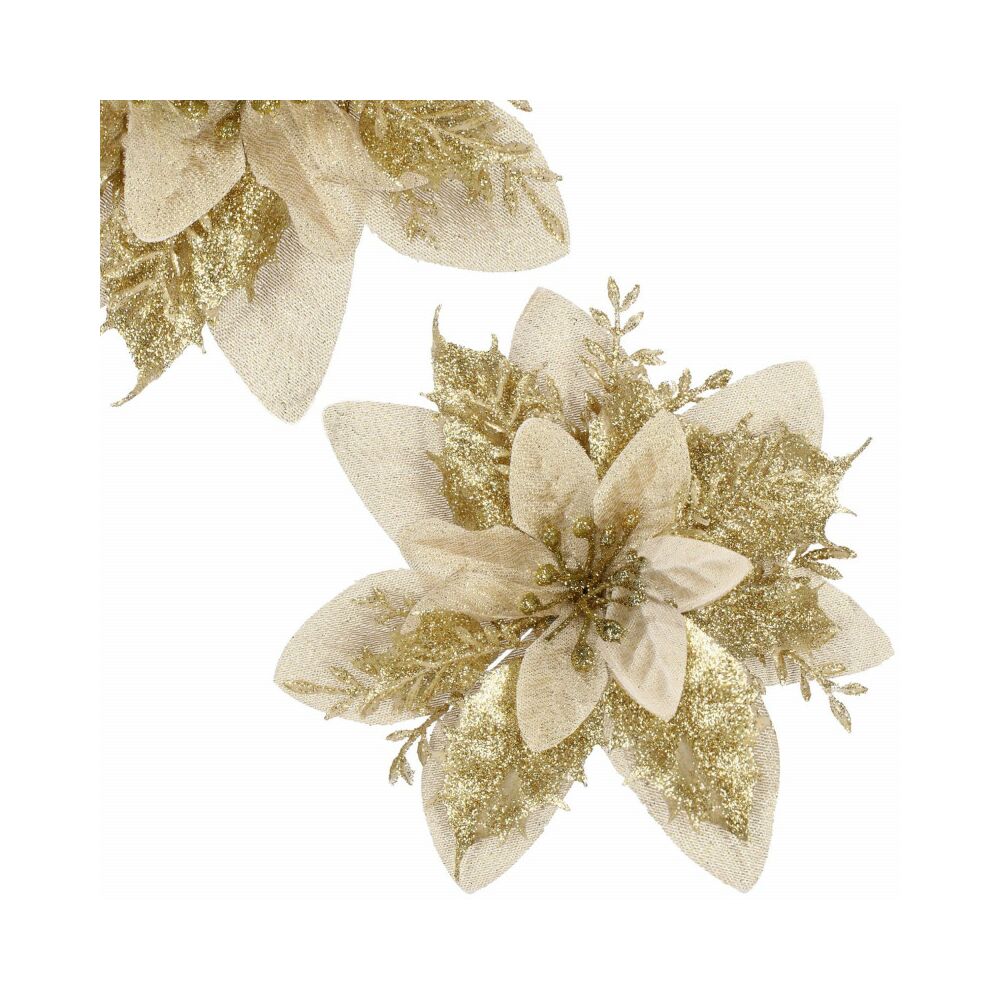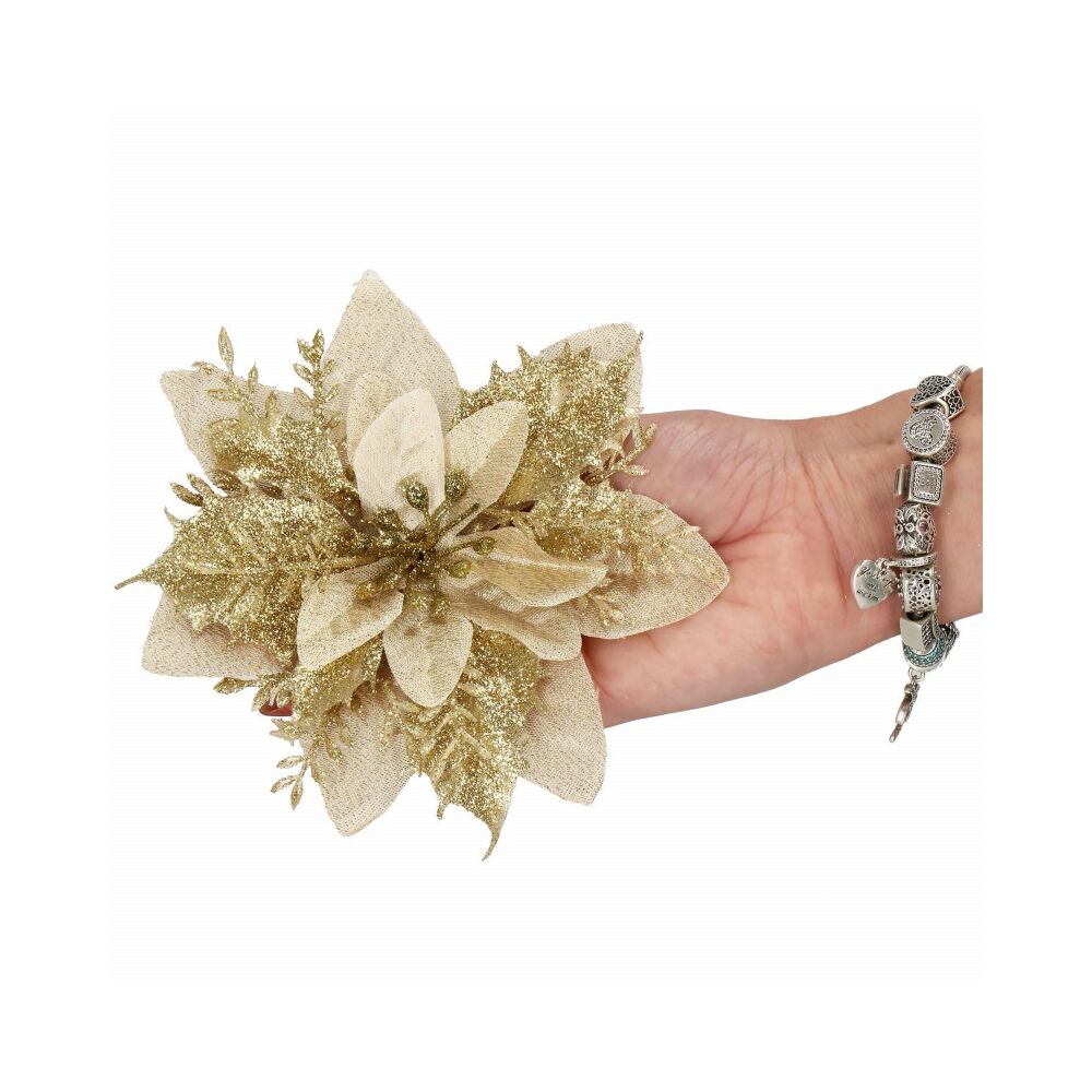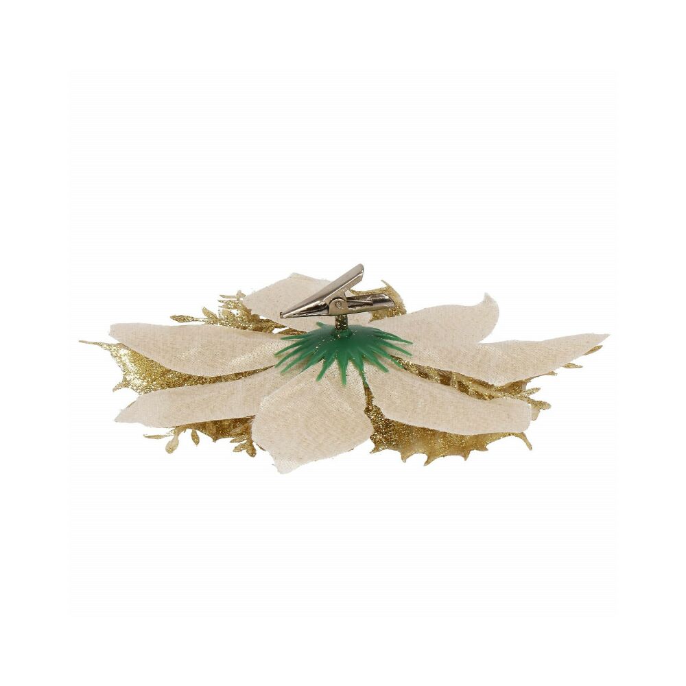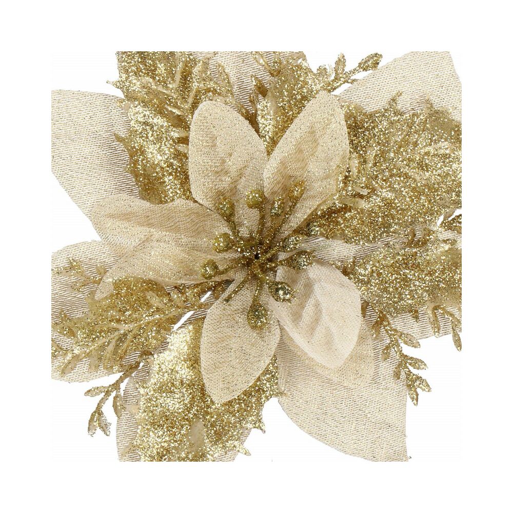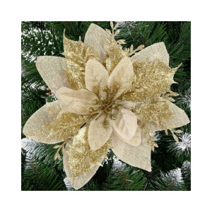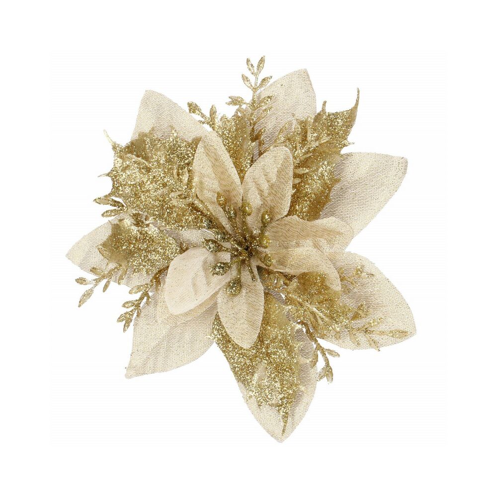 Umělý květ růže s klipem dokonale doplní vánoční výzdobu. Detailní provedení, elegantní třpytky, spodní klip pro snadné uchycení. Velikost 13x13 cm, zlatá barva.