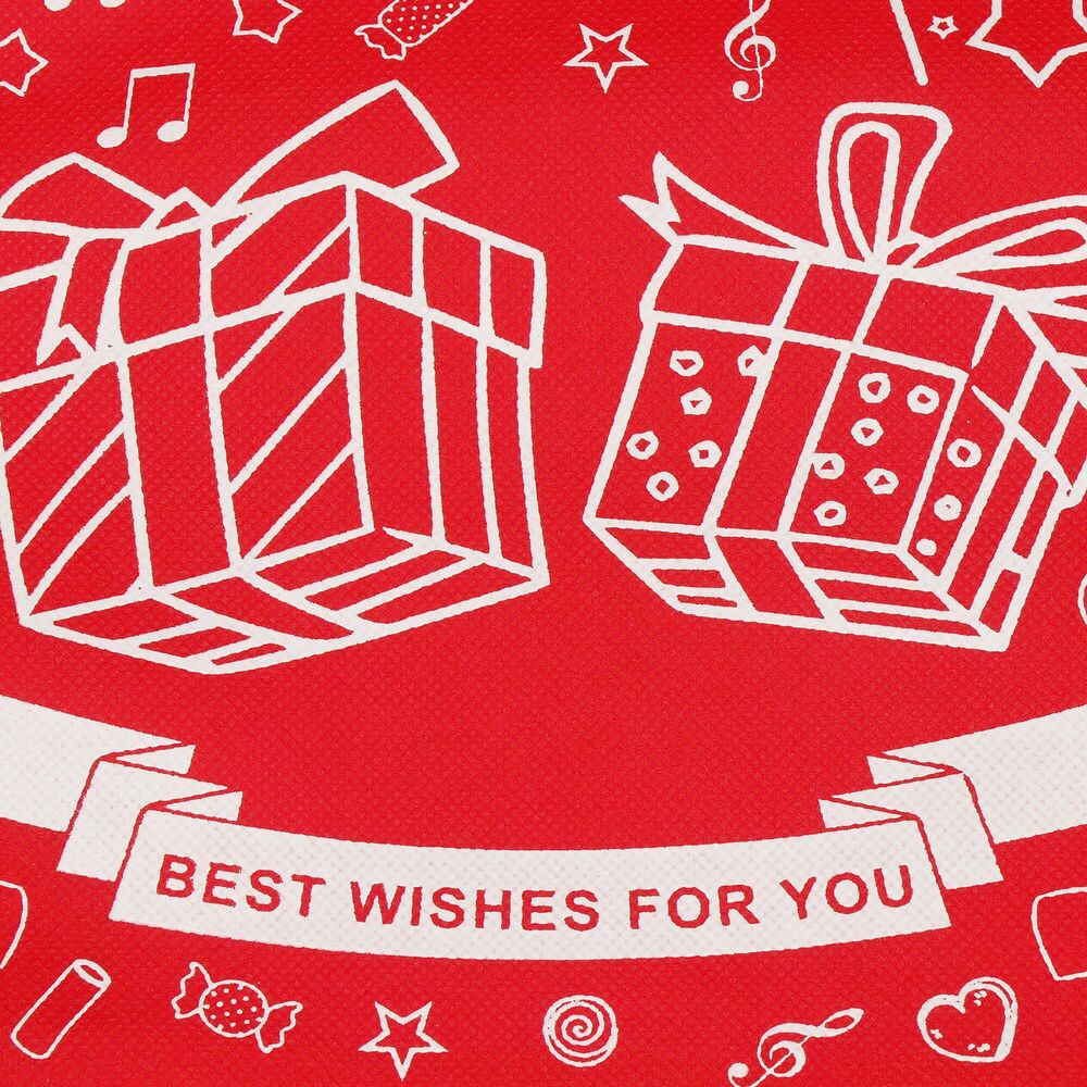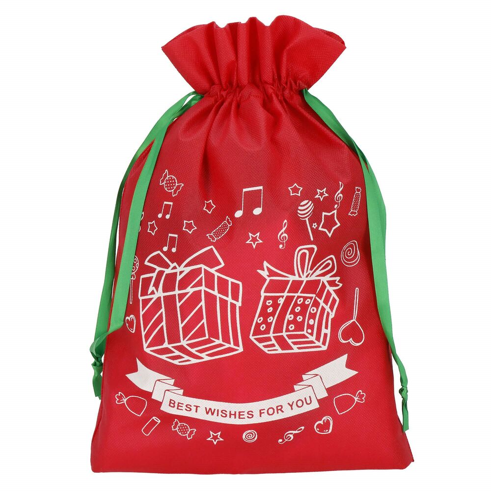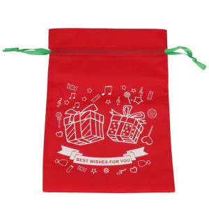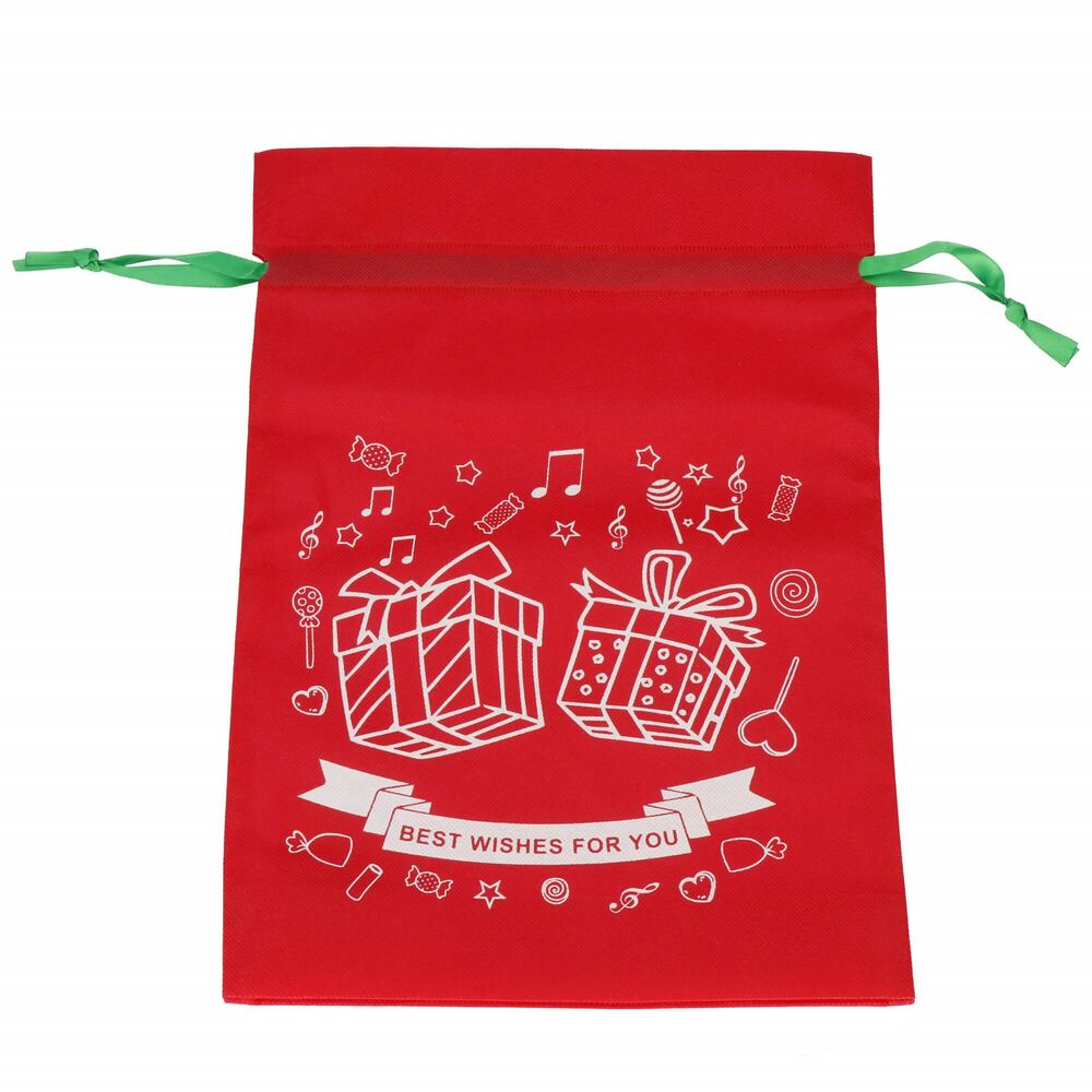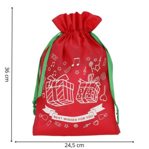Dotaz na produktČervený dárkový pytlík na vánoční dárky s obrázky dárečků. Uzavíratelný zelenou stuhou. Originální vánoční dekorace a způsob, jak zabalit vánoční / mikulášský dárek. Rozměry 36x24,5 cm. Materiál netkaná textilie.