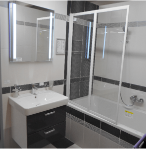 - Zástěna se skládá ze dvou pohyblivých dílů, které lze zcela složit do vnitřního prostoru nad vanu.