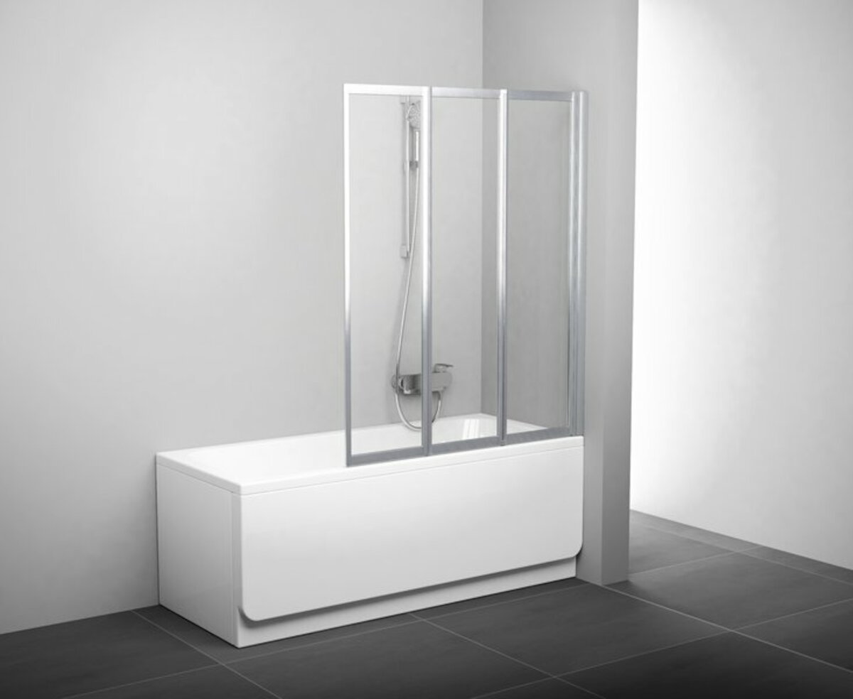 Vanová zástěna třídílná skládací Ravak VS3115TS, 115 cm, v barevném provedení Satin a čiré sklo. Praktická a univerzální. Sestává ze tří pohyblivých dílů, které lze zcela složit do vnitřního prostoru vany. Vhodná pro obdélníkové vany, ale přizpůsobí se i výjimečnému tvaru asymetrické vany BeHappy II a umožní pohodlné sprchování v nejmenších koupelnách.