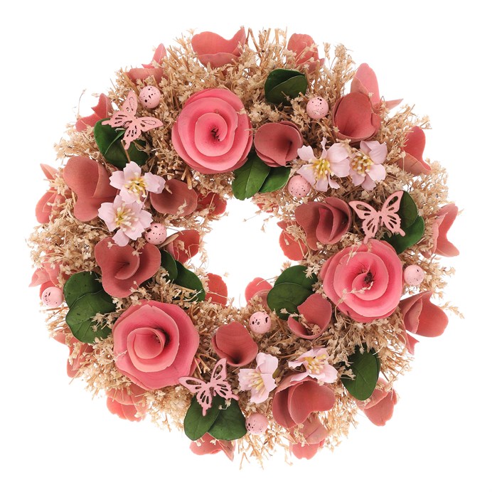 Dotaz na produktSlaměný věnec o průměru 25 cm zdobí růžové květy a drobná mini vajíčka, která mu dodávají jarní a svěží charakter. Provedení kombinuje přírodní odstíny slámy s jemnými růžovými tóny květin a zelenými listy, což vytváří příjemný vizuální efekt. Dekorace je doplněna o malé motýlky, které podtrhují lehkost a hravost celku. Věnec je vhodný pro zavěšení na dveře, stěnu nebo jako součást jarní výzdoby interiéru. Díky použití polystyrenu je dekorace lehká a snadno se s ní manipuluje.