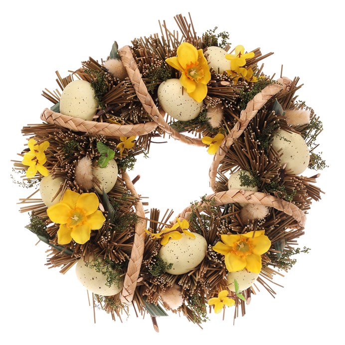 Dotaz na produktSlaměný věnec o průměru 30 cm je zdobený umělými vajíčky a žlutými květy, které dodávají dekoraci jarní atmosféru. Provedení věnce kombinuje přírodní odstíny slámy s výraznými žlutými detaily, které vizuálně oživují celkový vzhled. Věnec je vhodný k zavěšení na dveře nebo jako součást stolní dekorace během jarních svátků. Jeho lehká konstrukce umožňuje snadnou manipulaci a umístění v interiéru i exteriéru. Textura slámy a detailní zpracování květů přispívají k autentickému efektu.