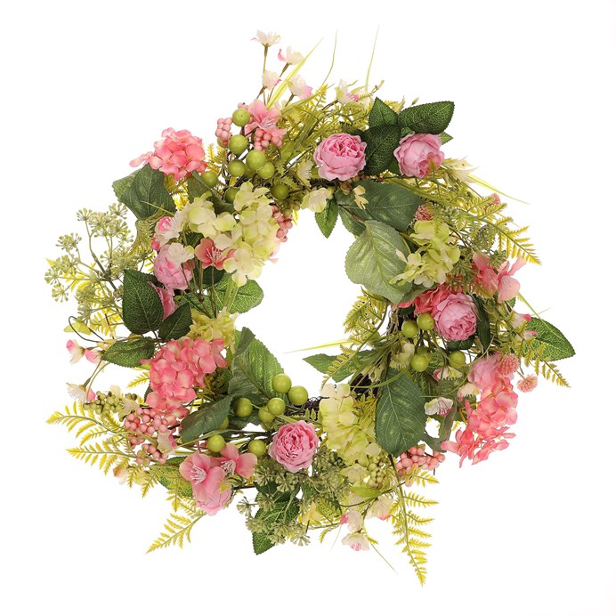 Dotaz na produkt Na splátky ještě dnesTento růžovo-zelený věnec o průměru 55 cm je vyroben z umělých květin, bobulí a kapradí, které mu dodávají svěží a živé barvy. Je to perfektní dekorace, která přinese do vašeho domova přírodní krásu a eleganci po celý rok.