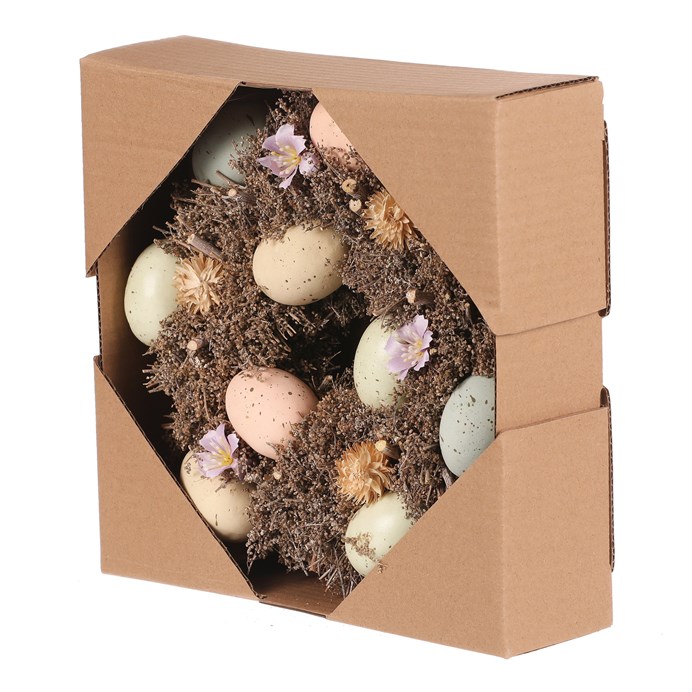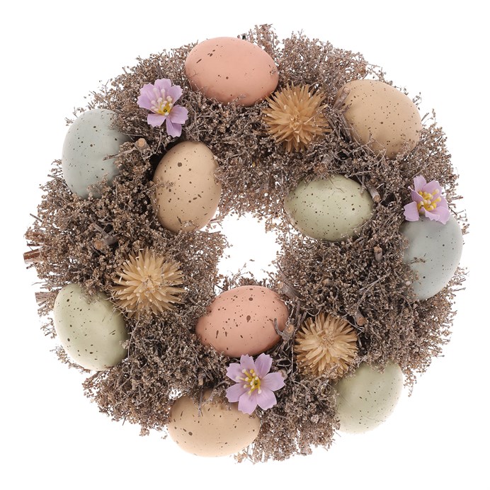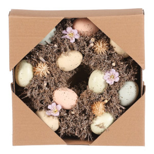 Dotaz na produktTento velikonoční věnec o průměru 24 cm má proutěný základ a je zdoben různobarevnými vajíčky, drobnými kvítky a větvičkami. Je to trvalá dekorace, ideální jak na pověšení, tak na umístění na stůl, která přinese do vašeho domova veselou a jarní atmosféru.
