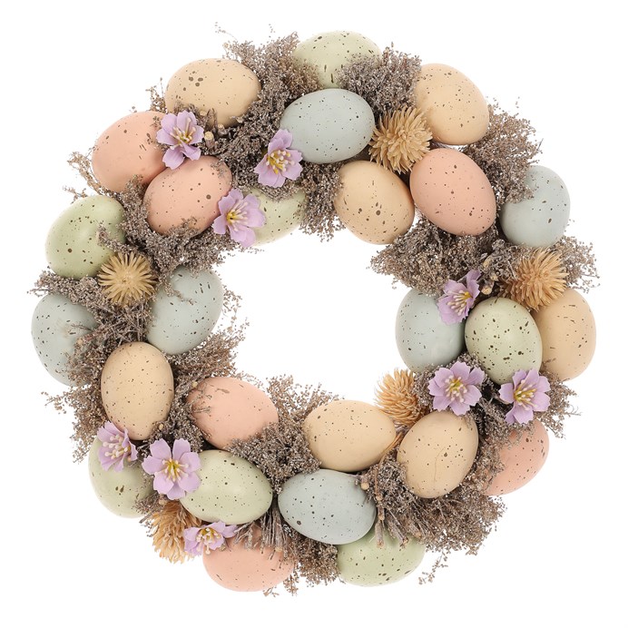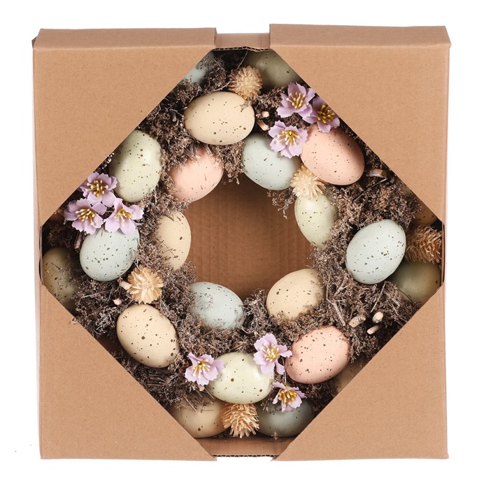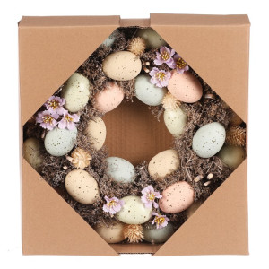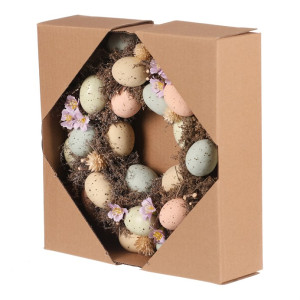 Dotaz na produktTento velikonoční věnec o průměru 30 cm má proutěný základ a je zdoben různobarevnými vajíčky, drobnými kvítky a větvičkami. Je to trvalá dekorace, ideální jak na pověšení, tak na umístění na stůl, která přinese do vašeho domova příjemnou jarní atmosféru.