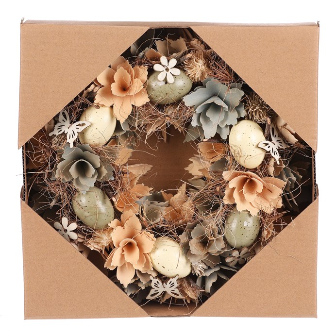 Dotaz na produktTento velikonoční věnec o průměru 30 cm je ozdoben umělými vajíčky, květy a motýly v příjemně barevných odstínech. Je to trvalá dekorace, která přinese do vašeho domova jarní kouzlo a radost, a bude krásná po mnoho dalších sezón. Ideální pro pověšení na dveře, stěnu nebo jako ozdoba na stůl.