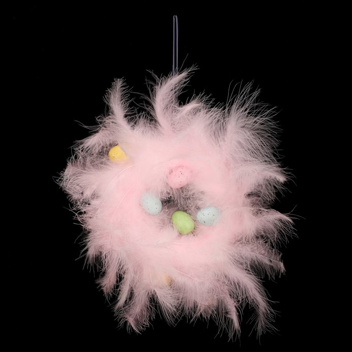 Dotaz na produktJemný věnec z růžového peří o průměru 25 cm přináší lehkost a kouzlo jarní atmosféry. Drobná barevná vajíčka dokonale dotvářejí velikonoční náladu. Skvělá dekorace na pověšení, která oživí dveře, okna nebo zdi a přivítá svátky ve veselém a pestrobarevném stylu.