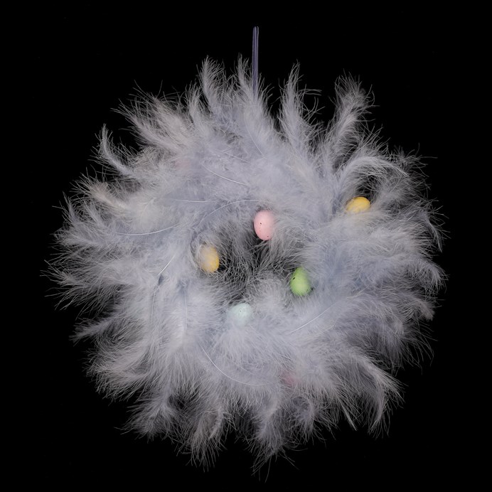 Dotaz na produktJemný věnec z modře zbarveného peří o průměru 29 cm přináší lehkost a kouzlo jarní atmosféry. Drobná barevná vajíčka dokonale dotvářejí velikonoční náladu. Skvělá dekorace na pověšení, která oživí dveře, okna nebo zdi a přivítá svátky ve veselém a pestrobarevném stylu.