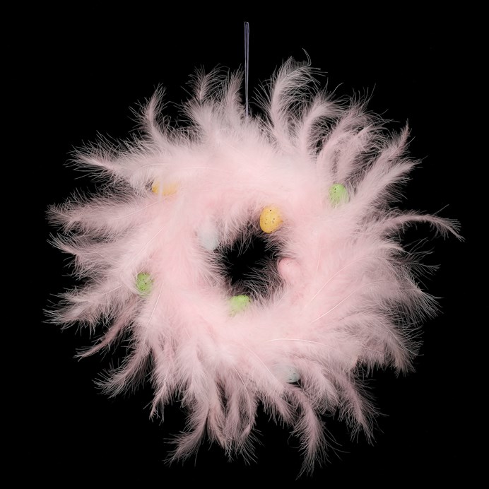 Dotaz na produktJemný věnec z růžového peří o průměru 29 cm přináší lehkost a kouzlo jarní atmosféry. Drobná barevná vajíčka dokonale dotvářejí velikonoční náladu. Skvělá dekorace na pověšení, která oživí dveře, okna nebo zdi a přivítá svátky ve veselém a pestrobarevném stylu.