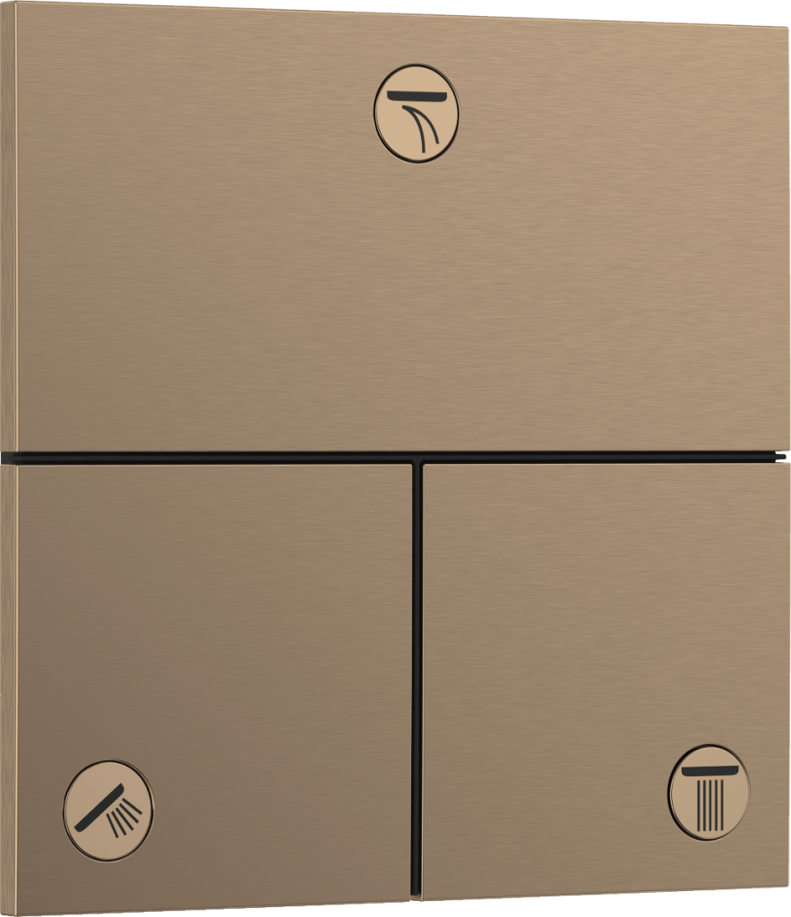 Zapůsobí svým designem i snadným používáním: až tři spotřebiče se jednoduše zapínají a vypínají použitím velkých tlačítek (Select). Fungují spolehlivě i s mokrýma nebo namydlenýma rukama a lze je ovládat i se zavřenýma očima (například při mytí vlasů). K ovládání množství a teploty vody je ventil kombinován s podomítkovým termostatem hansgrohe ShowerSelect Comfort ve stejném designu. Chcete-li používat více než tři spotřebiče, je ideální termostatická baterie ShowerSelect Comfort pro jeden spotřebič a další výtok Celkem jsou tedy možné až čtyři funkce.