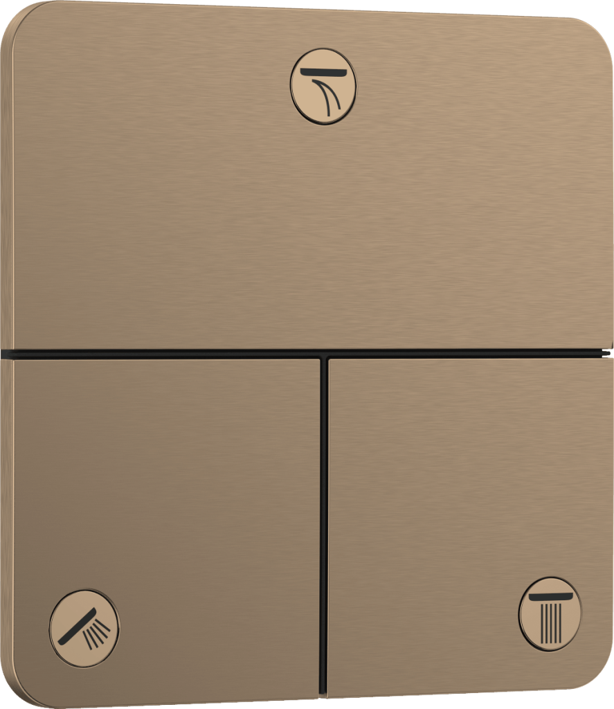 Zapůsobí svým designem i snadným používáním: až tři spotřebiče se jednoduše zapínají a vypínají použitím velkých tlačítek (Select). Fungují spolehlivě i s mokrýma nebo namydlenýma rukama a lze je ovládat i se zavřenýma očima (například při mytí vlasů). K ovládání množství a teploty vody je ventil kombinován s podomítkovým termostatem hansgrohe ShowerSelect Comfort ve stejném designu. Chcete-li používat více než tři spotřebiče, je ideální termostatická baterie ShowerSelect Comfort pro jeden spotřebič a další výtok Celkem jsou tedy možné až čtyři funkce.