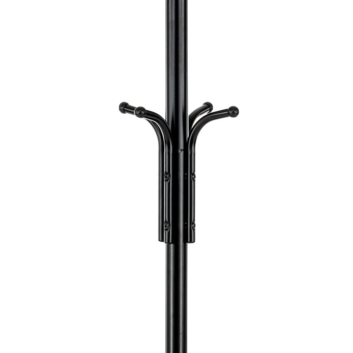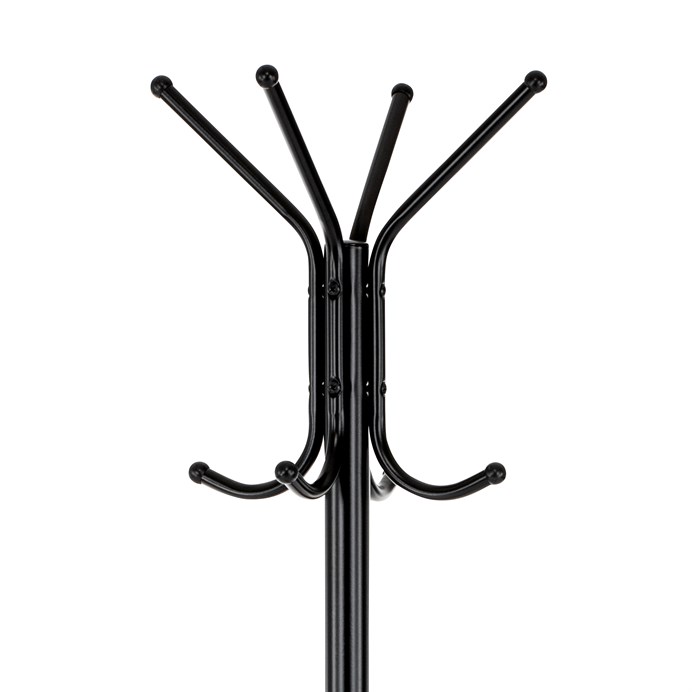 Dotaz na produktStojanový věšák s výškou 182 cm je vyroben z pevného kovu s matnou černou povrchovou úpravou, která zajišťuje odolnost proti poškození a snadnou údržbu. Věšák nabízí celkem deset háčků rozmístěných ve dvou úrovních, což umožňuje efektivní zavěšení kabátů, klobouků či tašek. Stabilní kulatá základna přispívá k bezpečnému postavení a nosnost 10 kg odpovídá běžným nárokům na zavěšení více kusů oblečení. Díky jednoduchému a funkčnímu designu se hodí do kanceláří, vstupních hal i domácností.