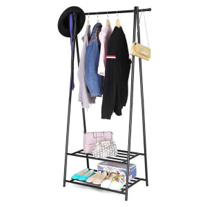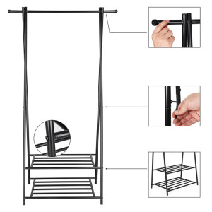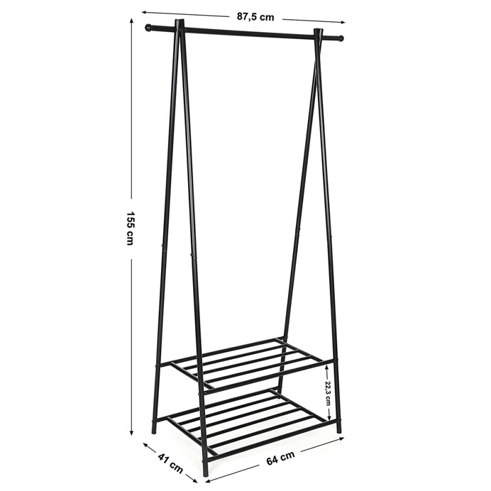 Dotaz na produktKovový věšák na šaty v černém provedení nabízí praktické řešení pro uspořádání oděvů i obuvi. Robustní rám je tvořený práškově lakovanými trubkami, které zajišťují stabilitu a dlouhou životnost. Věšák je vybaven horní tyčí pro zavěšení oblečení a dvěma policemi s roštovou konstrukcí, které umožňují odkládání bot nebo dalších doplňků. Díky jednoduchému designu a kompaktním rozměrům se hodí do předsíní, ložnic i šaten, kde pomáhá udržet pořádek a přehlednost. Celková nosnost odpovídá pevnosti materiálu a konstrukce umožňuje snadnou montáž i údržbu.