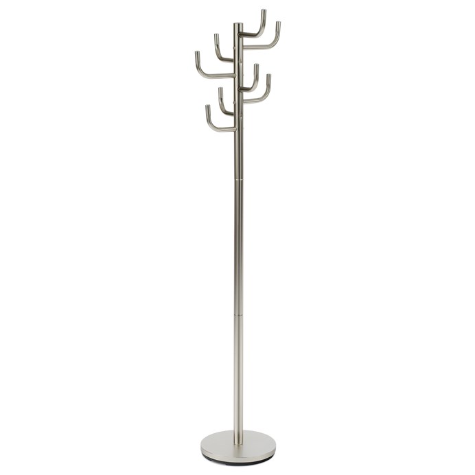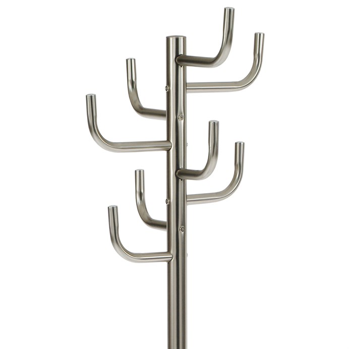 Stojanový věšák v broušeném niklu nabízí moderní a praktické řešení pro uspořádání oděvů a doplňků. Jeho tělo je tvořeno pevným kovovým materiálem s matným povrchem, který se snadno udržuje a odolává běžnému opotřebení. Věšák je vybaven osmi háčky rozmístěnými do tří úrovní, což umožňuje efektivní využití prostoru a přehledné zavěšení kabátů, šál či tašek. Stabilní kruhová základna zajišťuje pevnost a bezpečnost při používání, přičemž celková výška 175 cm je vhodná pro většinu interiérů. Nosnost věšáku dosahuje 10 kg, což odpovídá běžným požadavkům na domácí i kancelářské použití.