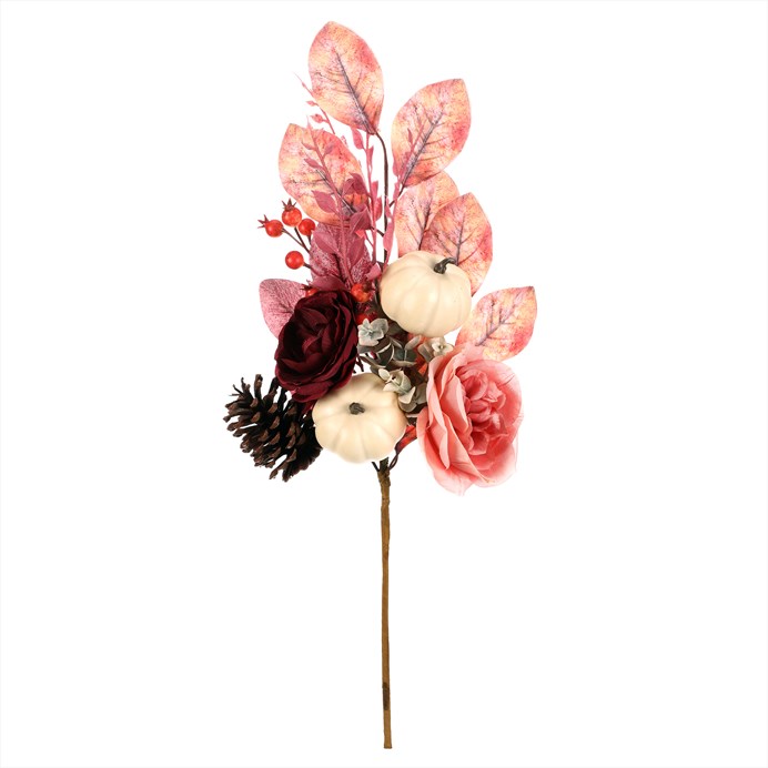 Dotaz na produktUmělá větev plná podzimní atmosféry spojuje květiny, dýně, šišky, bobule a listí v krásné kombinaci teplých odstínů. Mix květů v bílých, červených a růžových barvách dodává aranžmá jemnost, zatímco drobné dýně, bobule, listí a šišky podtrhují sezónní charakter dekorace. Ideální pro výzdobu stolů, věnců či váz, kde vytvoří útulnou a přirozenou podzimní atmosféru.
