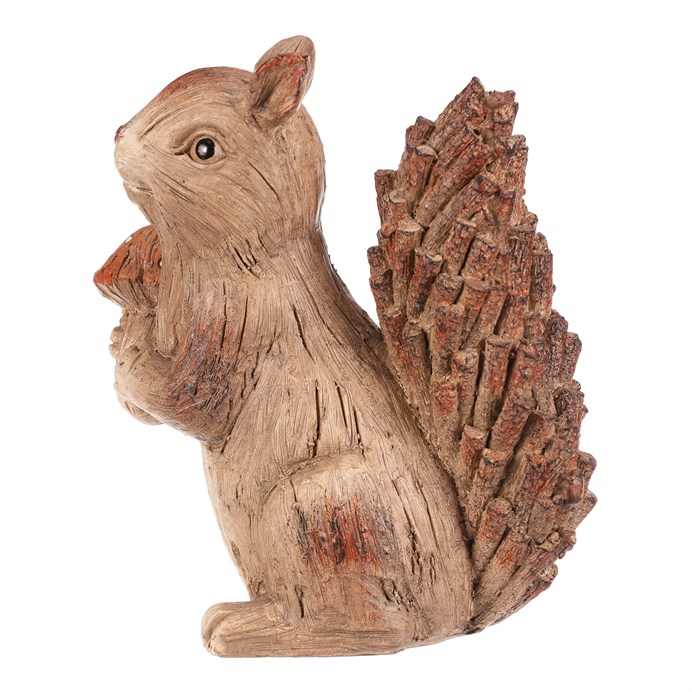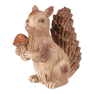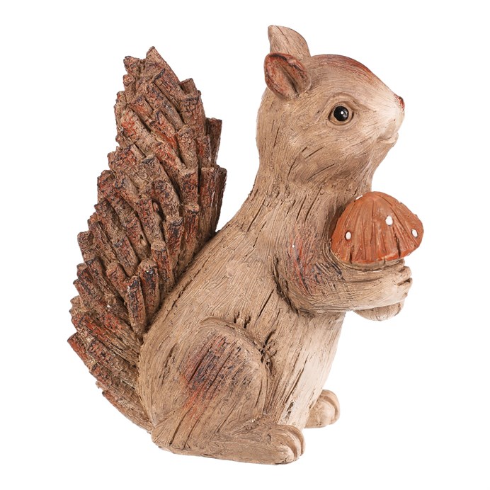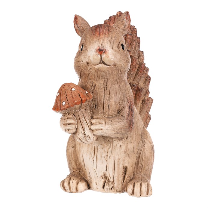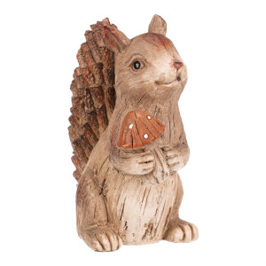 Dotaz na produktZahradní figurka v podobě veverky s červenou mochomůrkou krásně zapadne do vnějšího přírodního prostředí, čímž vytvoříte snadno a rychle krásné lesní zátiší. Veverka v béžovo-hnědých odstínech je vyrobena z polyresinu, ale vypadá jako by byla celá ze dřeva. Její ocásek je posetý jakoby drobnými nasekanými částmi větviček a zbytek těla má charakteristickou dřevěnou texturu.