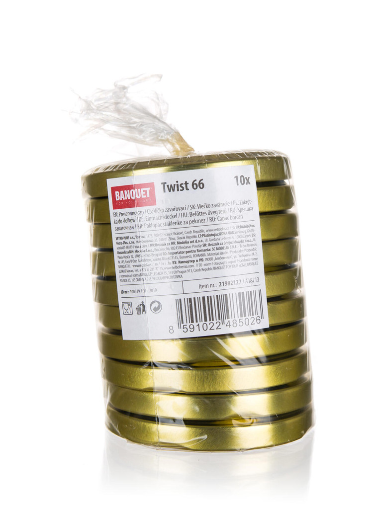 Dotaz na produktVíčko zavařovací TWIST o průměru 66 mm se závitem, je nezbytnou součástí zavařovacího procesu. Sada obsahuje 10 ks, dodávané ve zlaté barvě. V nabídce máme další typy a velikosti víček a ostatní položky programu zavařování např. zavař. sklenice, zavař. hrnce, uzavírací hlavy, kleště atp.