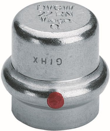 - na lisovacím přípoji červený bod a červený rámeček se symbolem - neschváleno pro instalace pitné vody