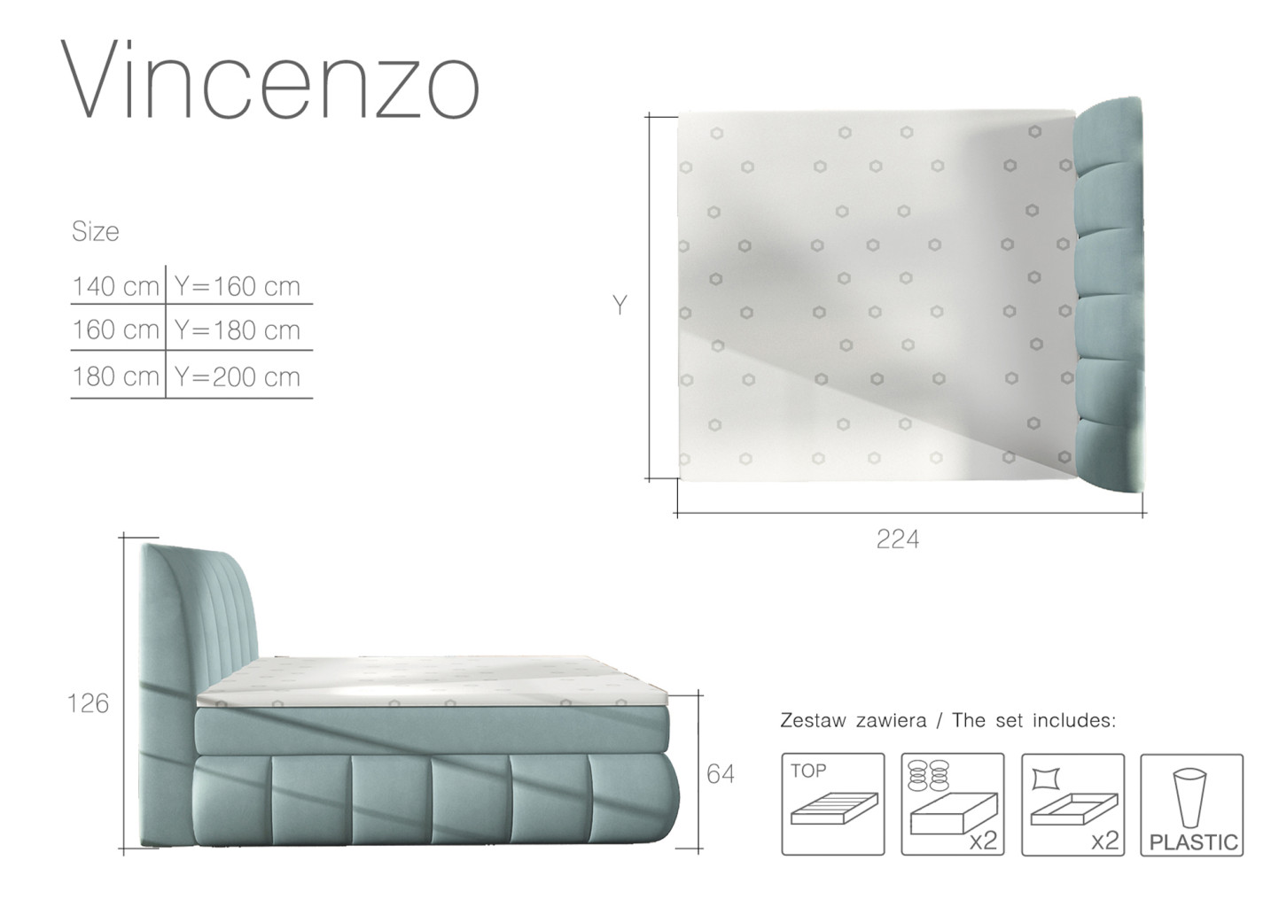 Dotaz na produkt Na splátky ještě dnesVincenzo je prostorná, nenápadná a originální kontinentální postel s boxspringovým systémem, která se vyznačuje výjimečnou měkkostí a bezkonkurenčním designem. Vzhled Vincenza je ovlivněn jak boxy kolem postele, tak i čelem postele vybaveným dodatečnou pěnou, které je zdobeno elegantním podélným prošíváním. Pozoruhodný efekt je také zdůrazněn čalouněním, které je k dispozici v mnoha barvách. Prostorná postel Vincenzo s plochou na spaní: 140/ 160/ 180 x 200 cm je ideálním místem k relaxaci kdykoli během dne i noci. Mezi další výhody tohoto modelu patří 20 cm vysoká matrace bonel s dalšími vrstvami - horní a spodní, vyrobenými z měkké a pružné pěny T25 a 4 cm silným čalouněným vrchním dílem. Pružinový mechanismus usnadňuje přístup k přihrádkám na ložní prádlo, které se nacházejí v boxu postele. Vincenzo - kus nábytku v moderním klasickém stylu - splňuje moderní pohled na interiérový design jedinečné ložnice. Pokud hledáte postel, která vás na 100 % potěší a zároveň je jedinečná - může být jen jedna volba. Látky: Monolith 77