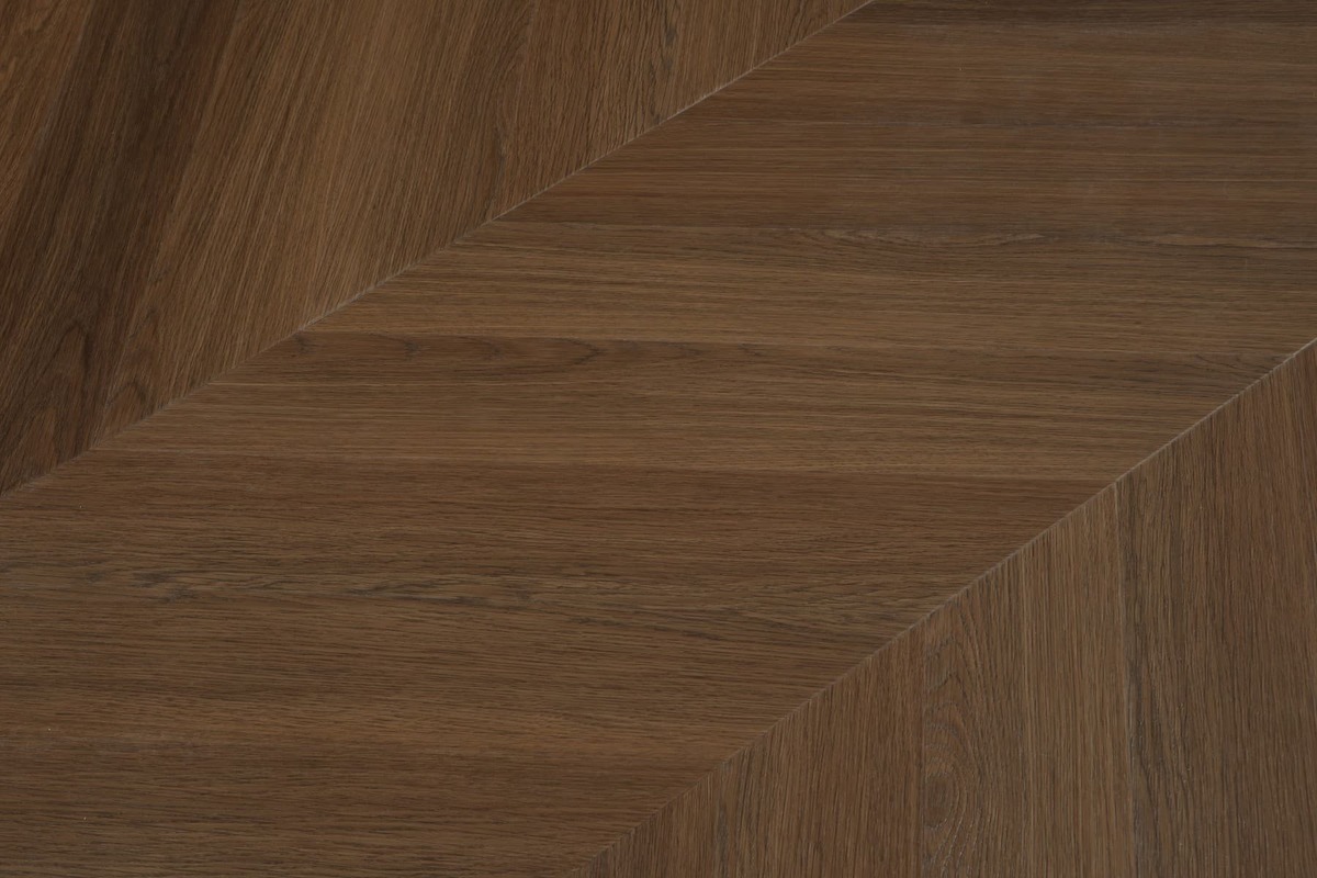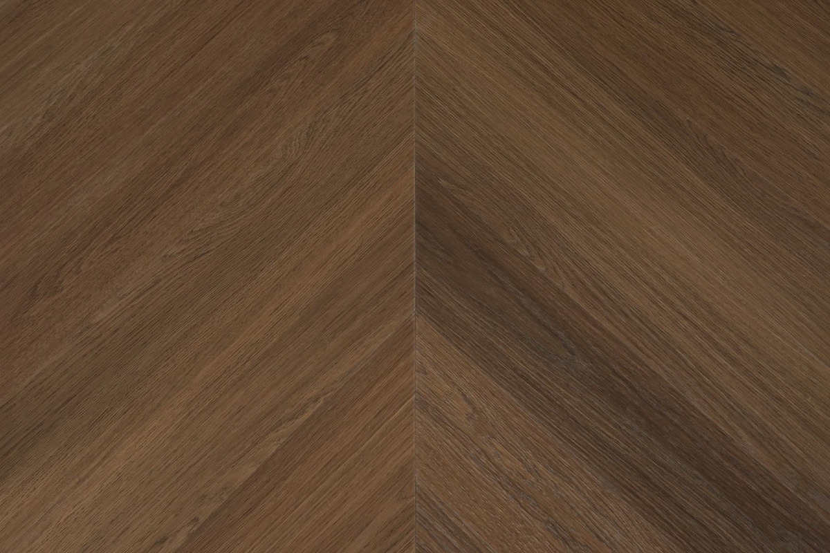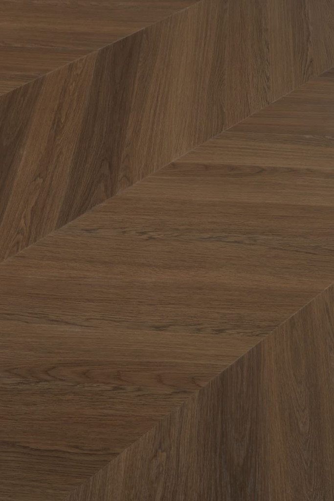 Díky integrované podložce z IXPS nebo korku je podlaha nejen pohodlná, ale také skvěle izoluje zvuk. Dekor dubu v odstínu střední hnědé s autentickou strukturou a vzorem Chevron dodává interiéru elegantní a přírodní vzhled.