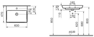 VITRA T4 umyvadlo na desku 60 cm, s otvorem pro baterii, bez přepadu