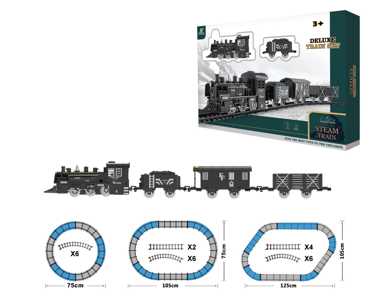 Dotaz na produktVlak s kouřovými efekty set s dráhou 125x105 cm. Vlak vydává zvukové, a kouřové efekty. Voda se nalévá do nádržky pod stříbrným komínem. ON/OFF spínač na levém boku. 3 způsoby složení trati: 75x75 cm 105x75 cm 125x105 cm Návod na výměnu baterií, propojení vagónů a doplnění vody se nachází na obalu. Baterie 4xAA, nejsou součástí.