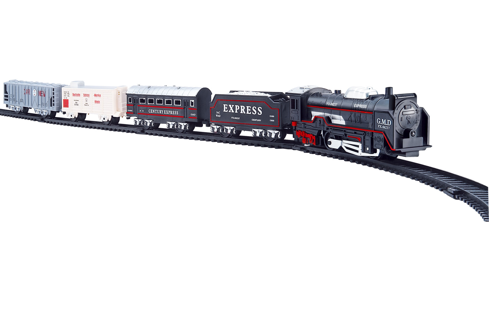 Dotaz na produktVlak set. Délka trati 210 cm. Součástí mašinka, 4 vagóny, 4 rovné kolejnice, 10 zahnutých kolejnic. Velikost mašinky 13 cm, vagónů 10-13 cm. 2xAA baterie do mašinky nejsou součástí. Přepínač ON/OFF na pravé straně mašinky.