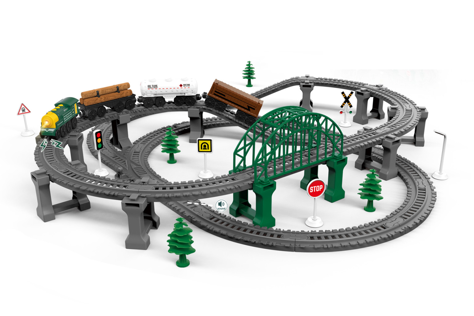 Dotaz na produktVlak trať s efekty. Rozměry sestavené trati 77x76x16 cm. Vláček je propojený magnety. Trať vydává zvukové efekty. Aktivace tlačítky na mašince - prostřední tlačítko ON/OFF, směrová tlačítka pro jízdu v daném směru. Část trati aktivuje zvukové efekty, 1x3V CR2032 baterie jsou součástí. Vláček - 2xAAA (1,5V), nejsou součástí. Sada se skládá z 110 dílků.
