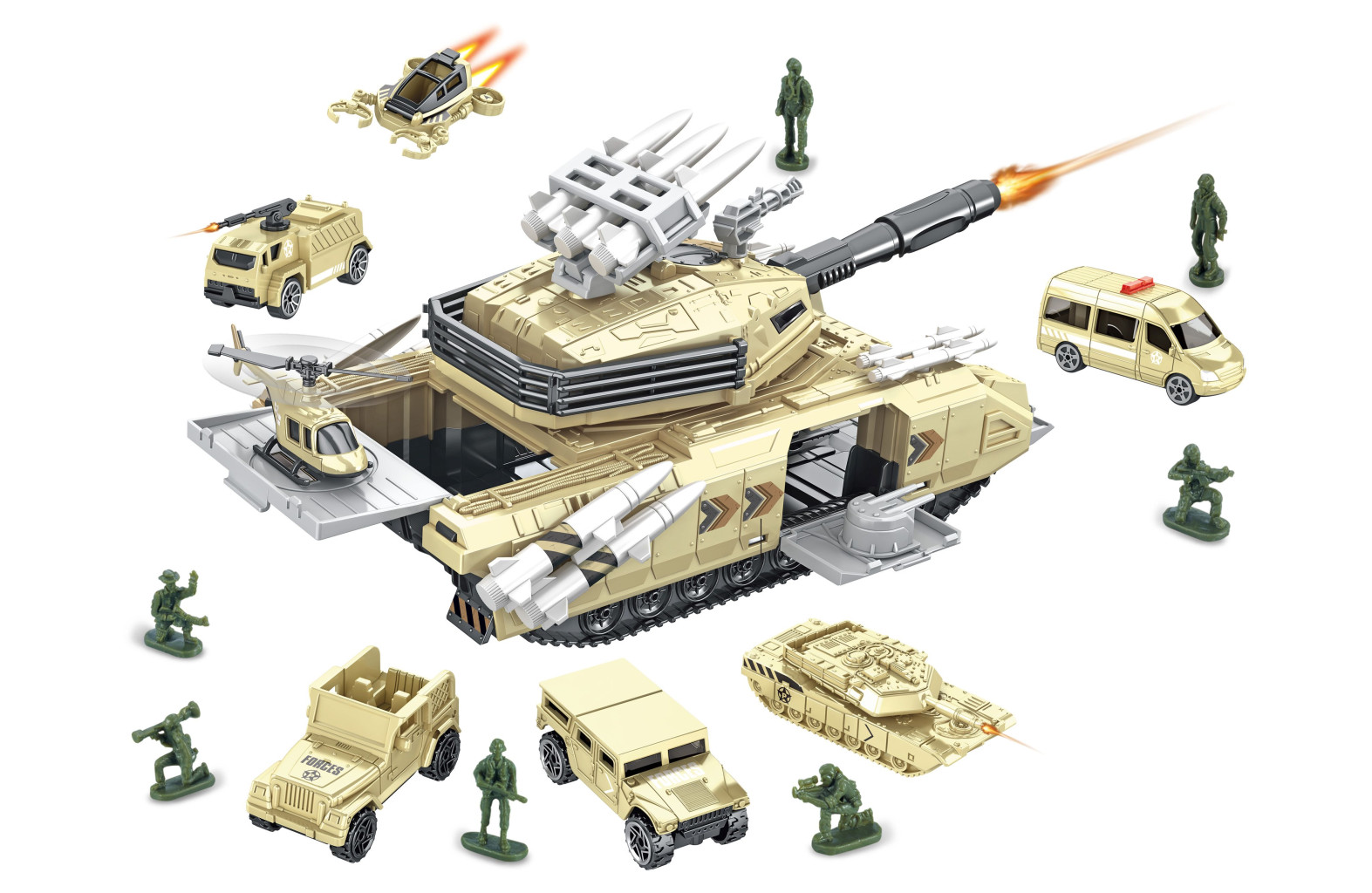 Dotaz na produktVojenská stanice tank. Velikost velkého tanku 26 cm, malých vozidel a vrtulníku 7-8 cm. Volná kola. Obsahuje: velký tank, 7 vojenských dopravních prostředků, 10 figurek vojáků, zbraně, polepy. Obrázkový návod na sestavení na zadní straně obalu.