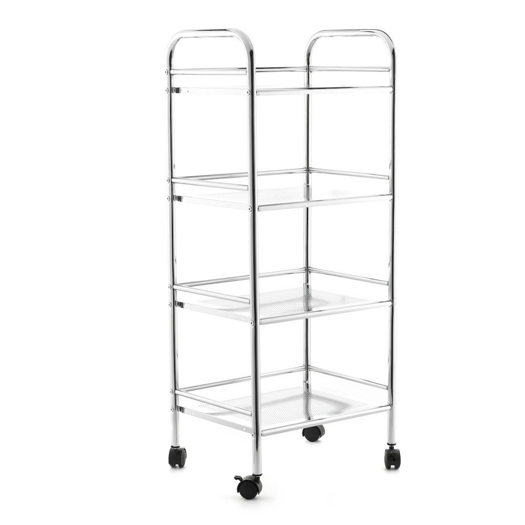 Dotaz na produkt Na splátky ještě dnesElegantní snadno omyvatelný pojízdný vozík na kolečkách 40 cm se čtyřmi poličkami, je praktickým pomocník hodící se do každé koupelny.