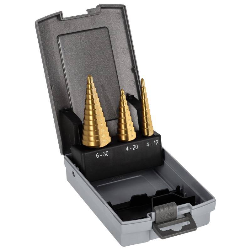 - sada třístupňových vrtáků o průměru od 4 do 30 mm. Strukturální povlak: TiN povlak z nitridu titanu